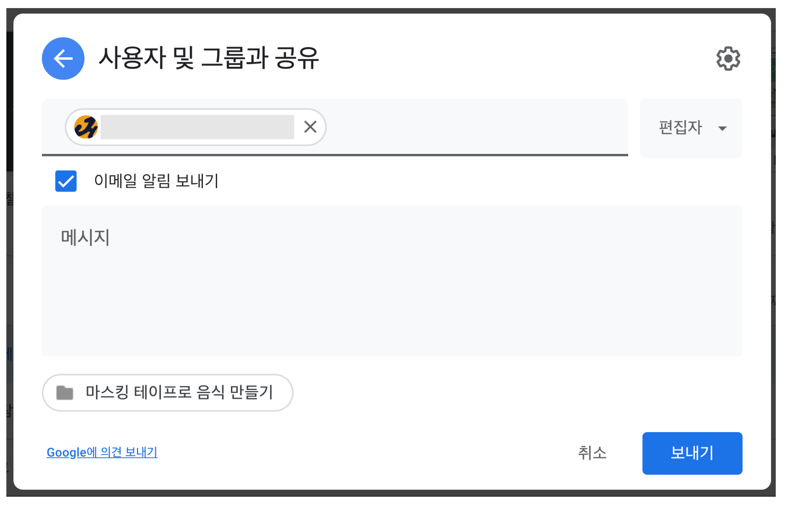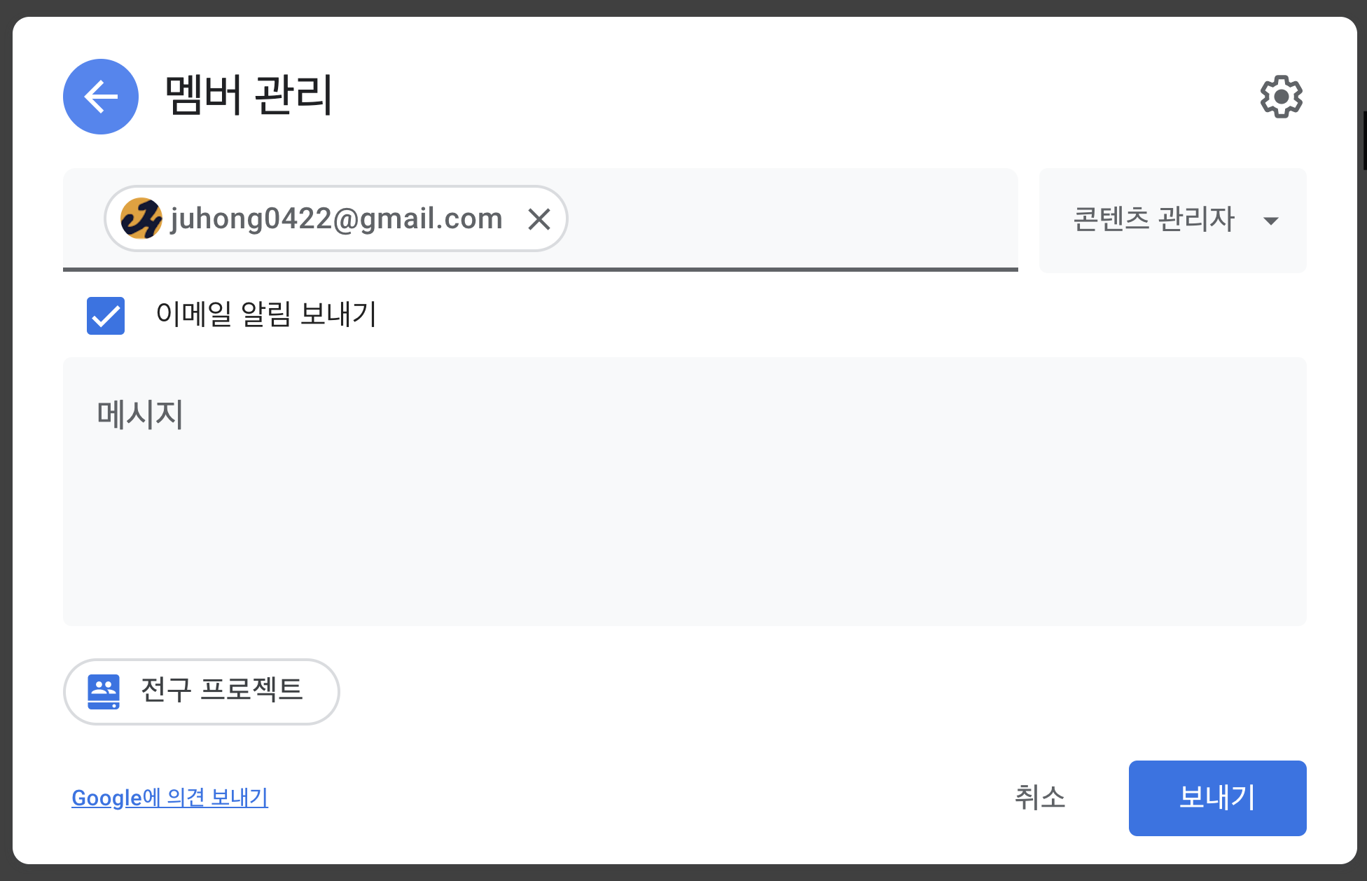 3) 해당 이메일 주소로 권한이 추가되었음을 알려주고 이메일을 보내주고 싶은 경우, 이메일 알림 보내기에 체크합니다. 그리고 원한다면, 알림 이메일에 함께 적을 메시지를 입력합니다.