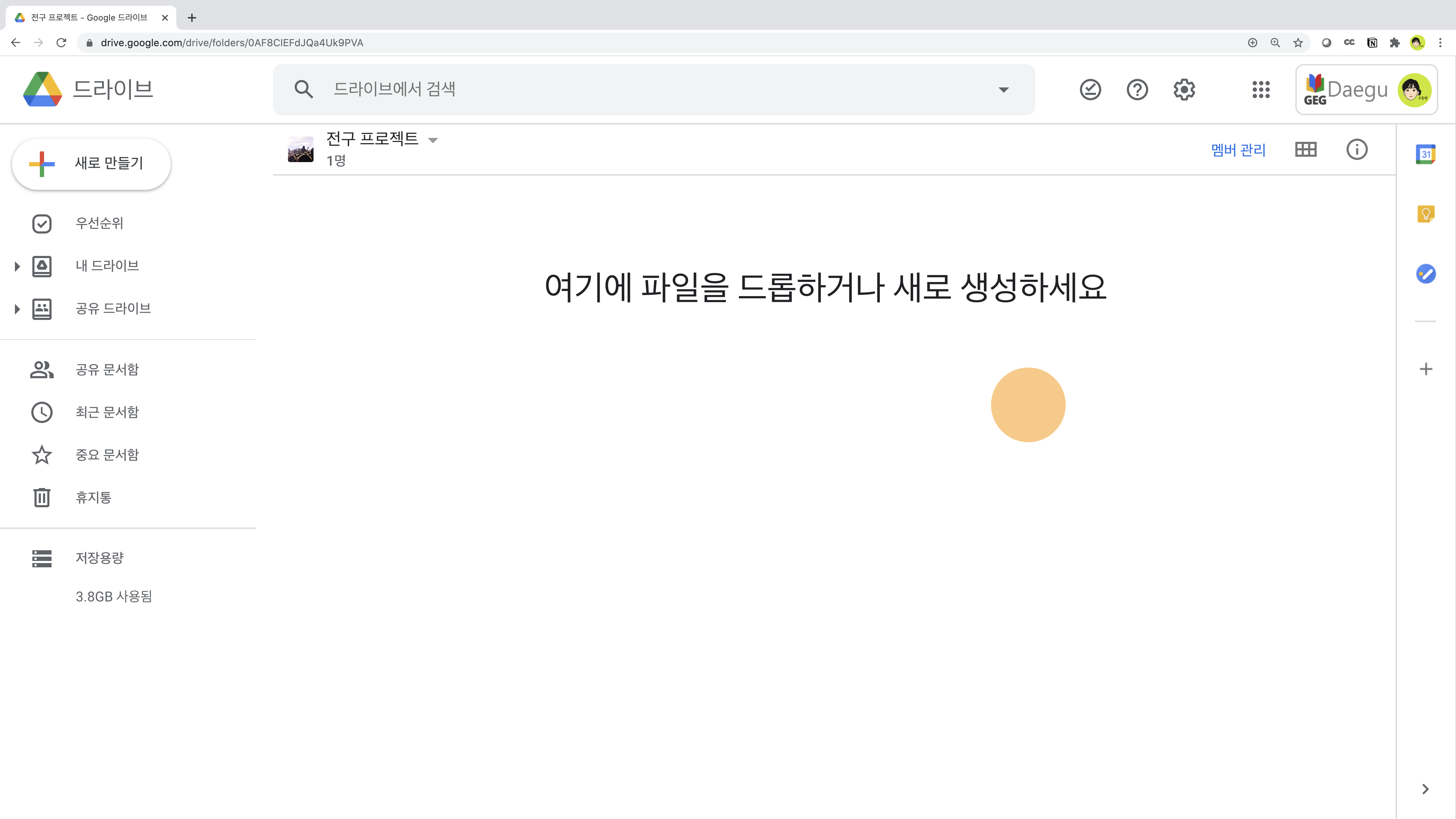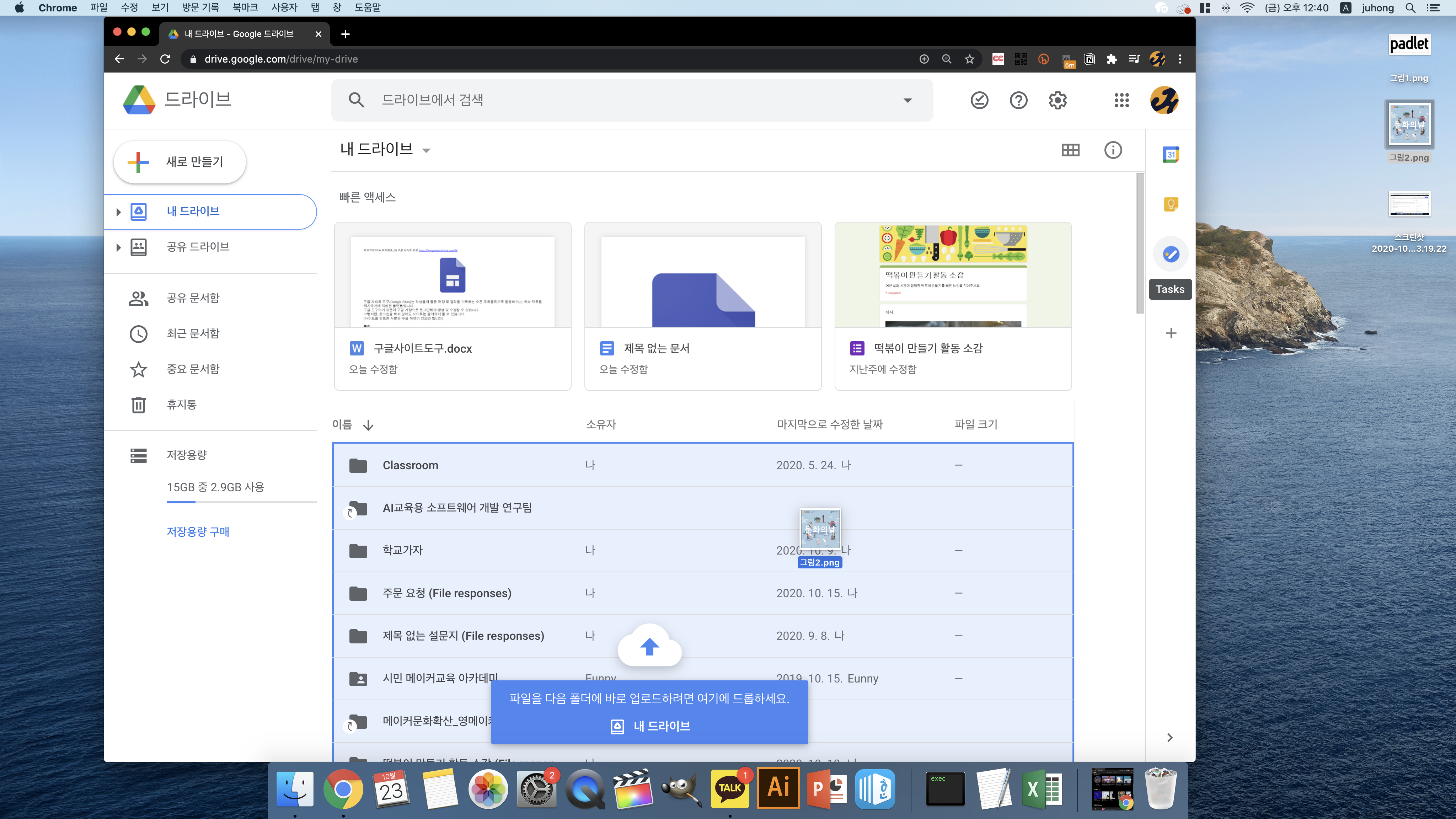 - 구글 드라이브가 켜진 탭에 파일을 직접 끌어다 넣어도 됩니다.