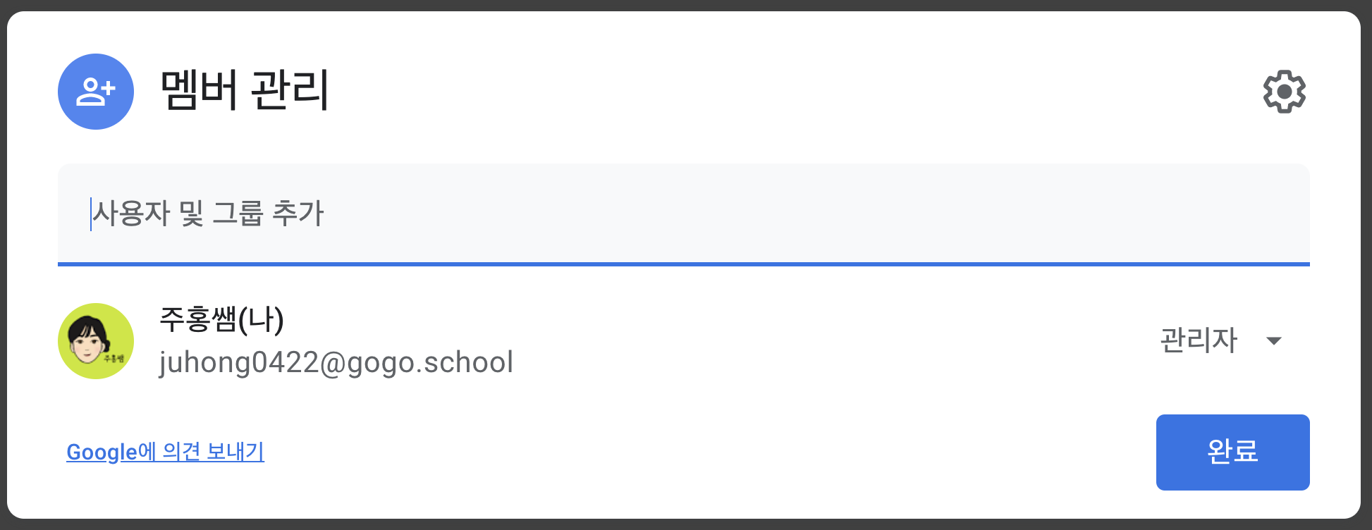 1) 위의 창에서 사용자 및 그룹 추가 부분에 사용자나 구글 그룹의 이메일을 직접 입력하고 엔터키를 누릅니다. 여러 개의 이메일을 추가할 경우, 이메일은 콤마(,)로 구분합니다.