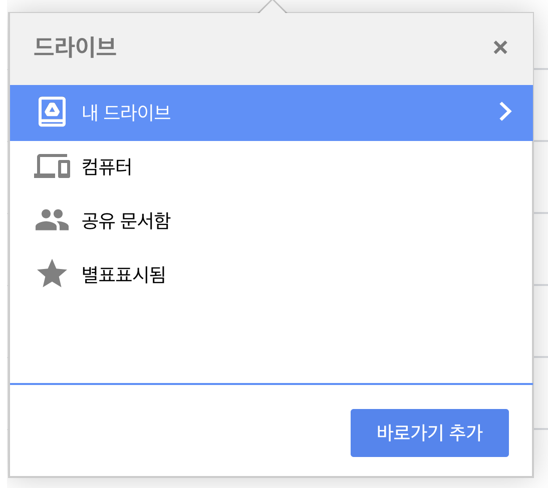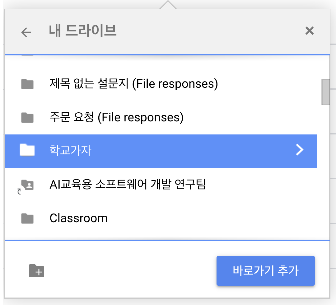 드라이브에 바로가기 추가를 누르고, 원하는 위치로 이동한 뒤( > 버튼을 누르면 폴더 안으로 이동할 수 있습니다.) 하단의 바로가기 추가 버튼을 누릅니다.