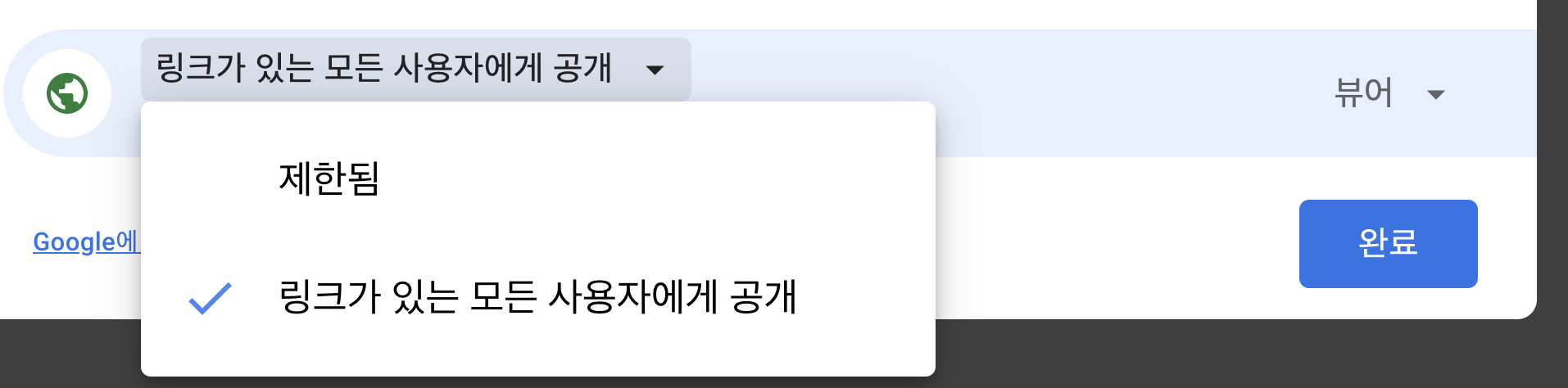 - 조직명(G Suite 계정인 경우에만 나타남): 조직의 구성원만 이 링크로 들어와 편집할 수 있습니다.