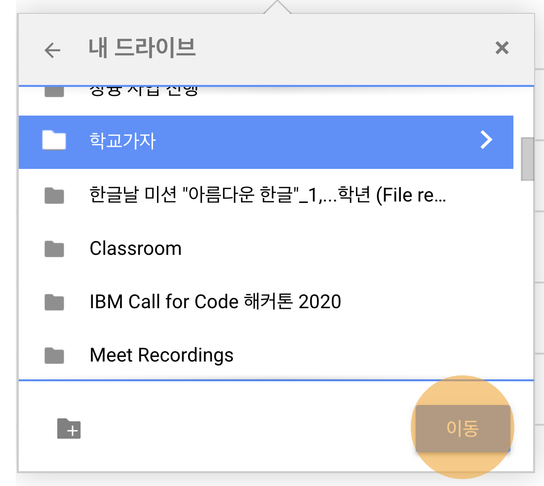 3) 원하는 위치로 이동한 뒤, 원하는 폴더를 클릭하고 아래쪽의 이동 버튼을 누릅니다. 그럼 그 폴더 안으로 파일이 들어갑니다.