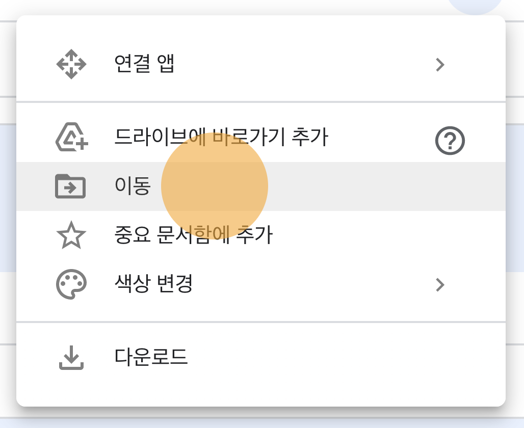 3) 뜬 목록에서 이동을 누르고, 원하는 위치로 이동한 뒤 이동 버튼을 누릅니다.