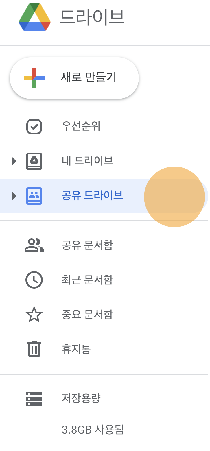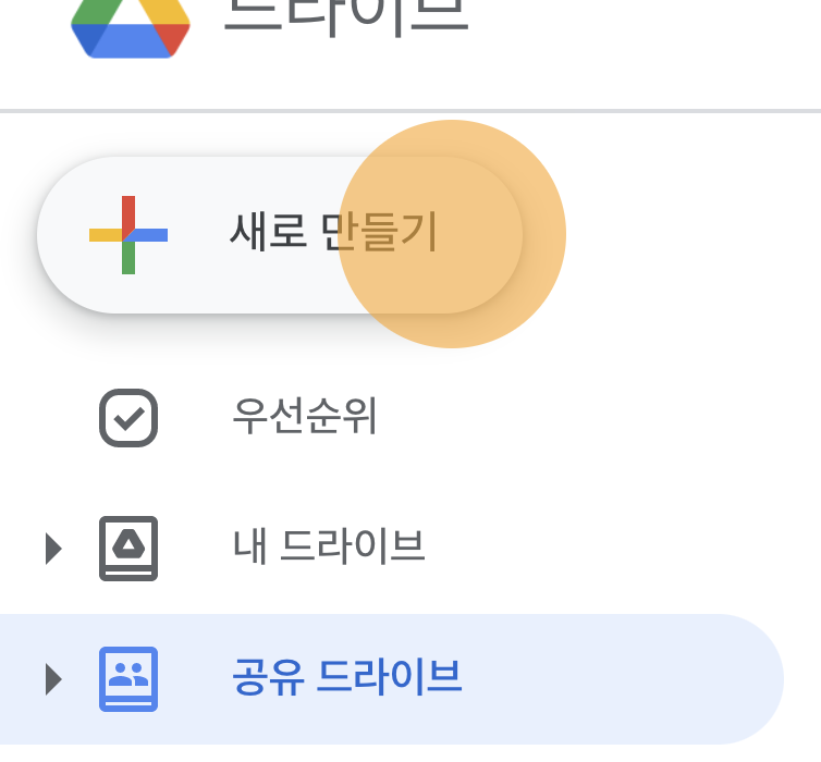 왼쪽의 목록에서 공유 드라이브를 눌러 공유 드라이브로 이동합니다.