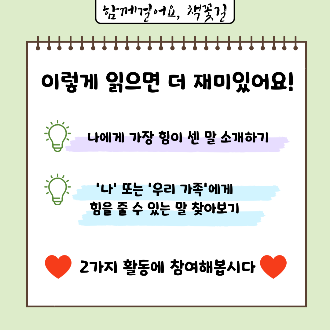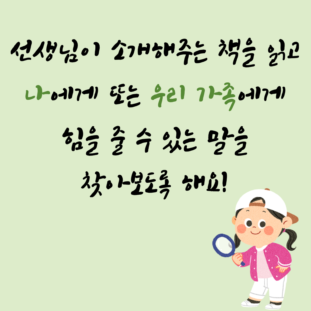선생님이 소개해주는 책을 재미있게 읽고, 나에게 또는 우리 가족에게 힘을 줄 수 있는 말(세상에서 가장 힘이 센 말)을 찾아보도록 해요! 선생님과 함께 책을 읽어볼까요?