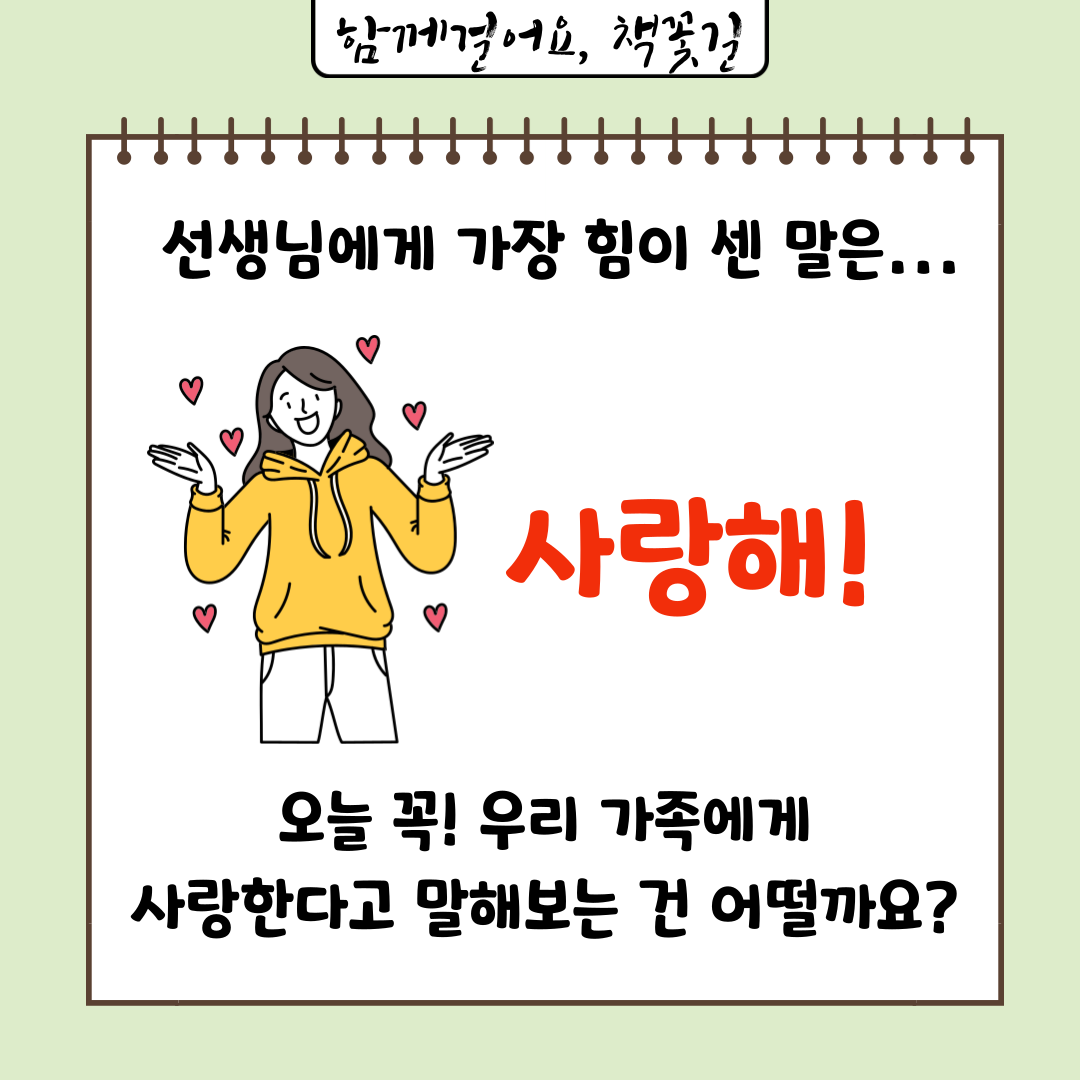 선생님이 소개해주는 책을 재미있게 읽고, 나에게 또는 우리 가족에게 힘을 줄 수 있는 말(세상에서 가장 힘이 센 말)을 찾아보도록 해요! 선생님과 함께 책을 읽어볼까요?