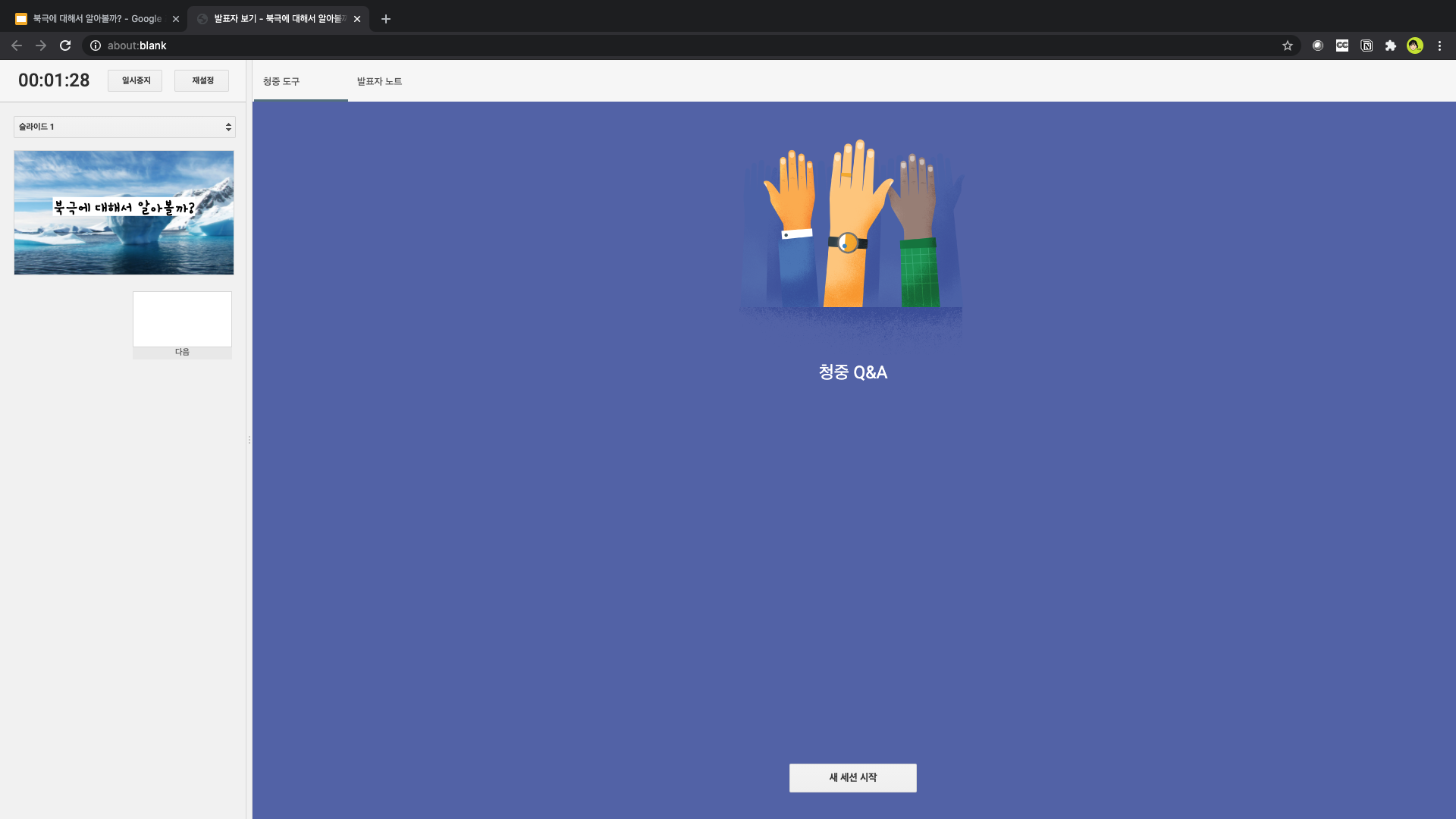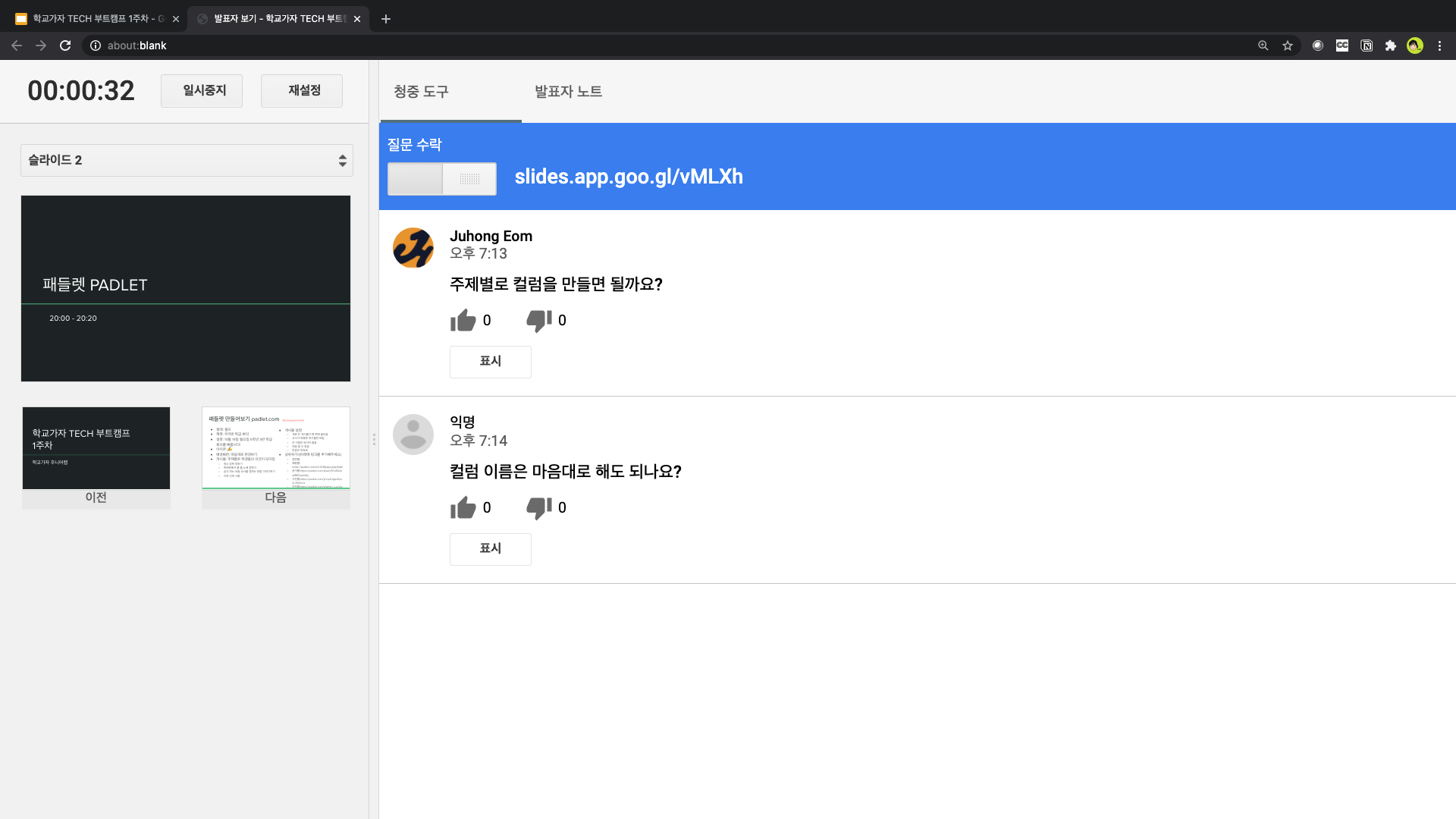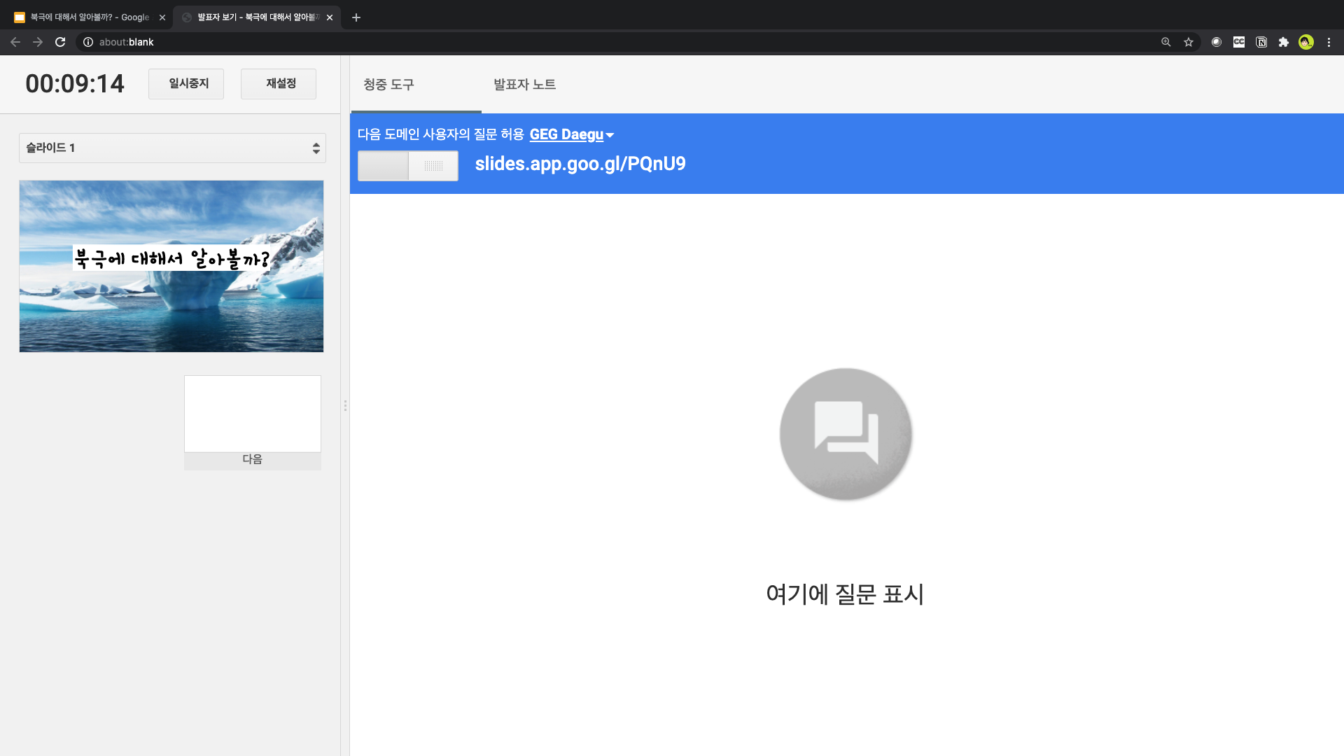 기능을 켜면 위와 같은 두 개의 탭이 생깁니다. 발표 화면에는 상단에 질문을 제출할 수 있는 링크가 나타납니다.