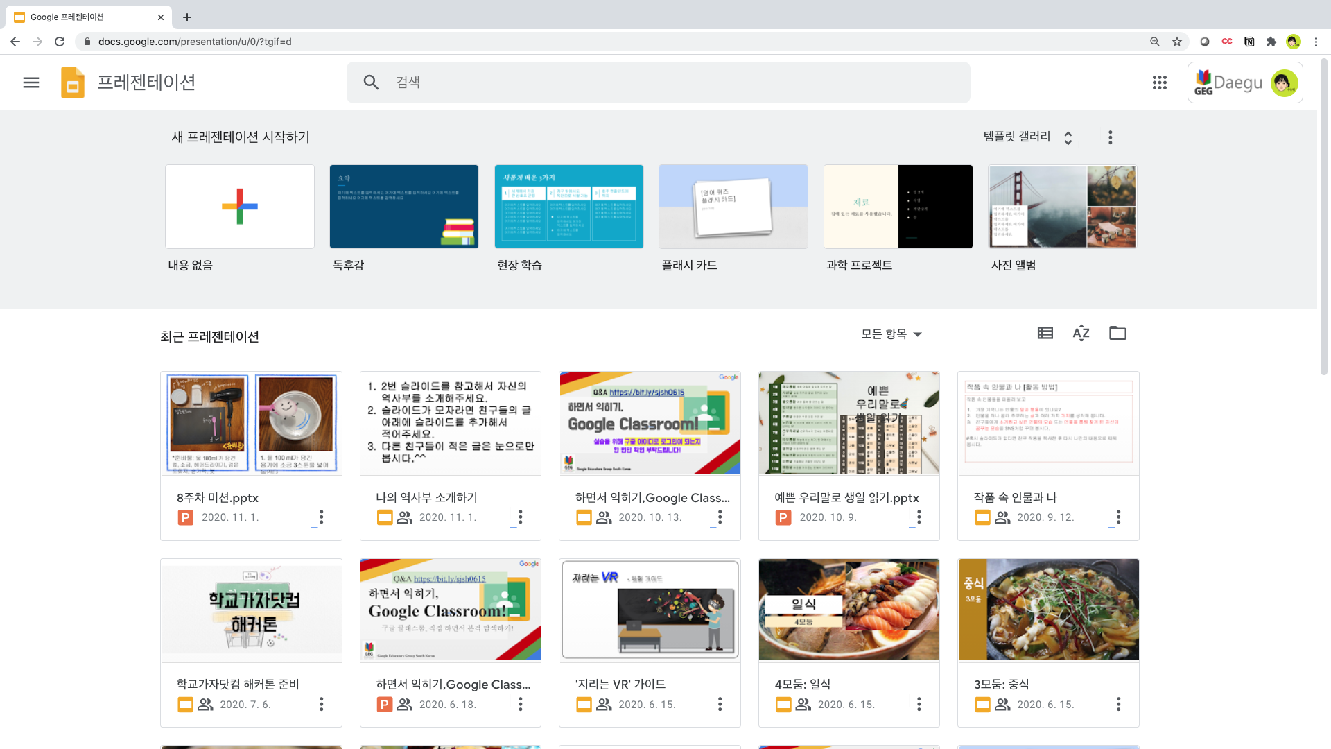 물론, 이 예시들을 활용할 수도 있습니다. 또 구글 프레젠테이션으로 어떤 것들을 만들 수 있는지 활동의 종류를 탐색할 수 있는 좋은 자료입니다. 우리는 빈 문서를 만들어 요리조리 탐색해 보겠습니다!