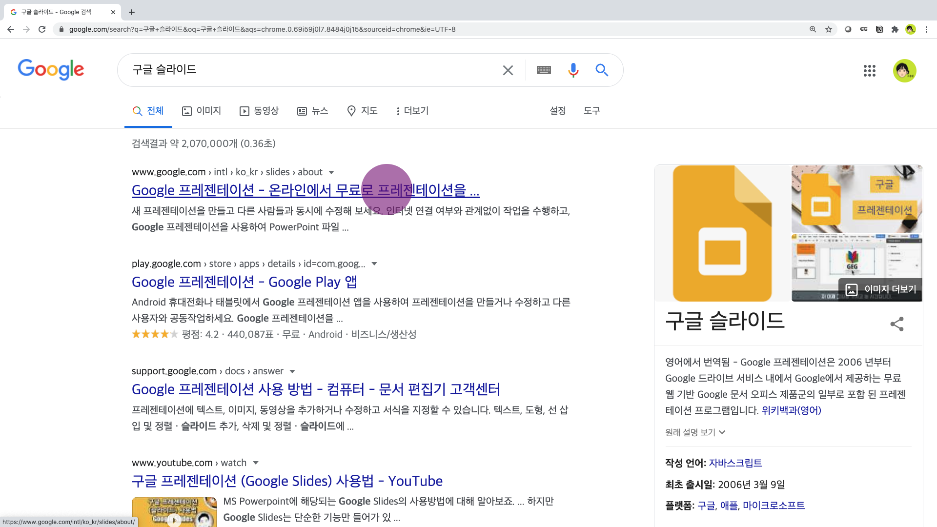 크롬을 사용하고 있다면, 오른쪽 상단에 '이미지'와 프로필 사진 사이의 점 9개 버튼을 클릭합니다. 뜬 창에서 프레젠테이션을 클릭합니다.