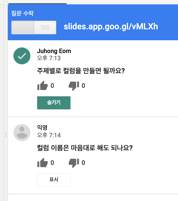 왼쪽 사진처럼 발표자가 특정 질문의 표시 버튼을 누르면, 오른쪽 사진과 같이 바뀝니다.
