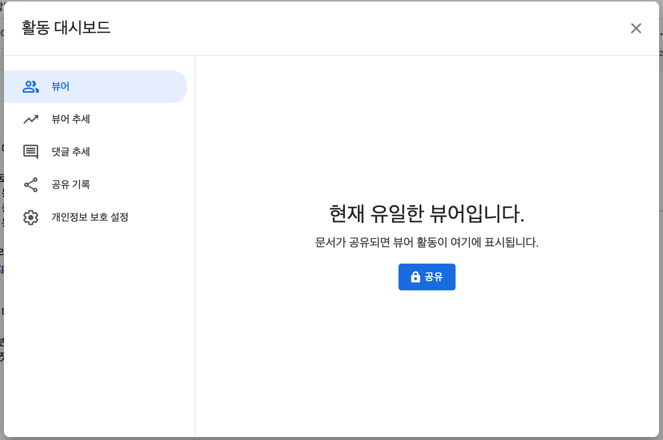 - 문서 설정 - 이 문서의 보기 기록 표시: 해당 계정의 보기 기록을 다른 사람들(문서 편집자 및 소유자)이 조회할 수 있도록 하는 기능입니다. 이 문서에만 적용됩니다.