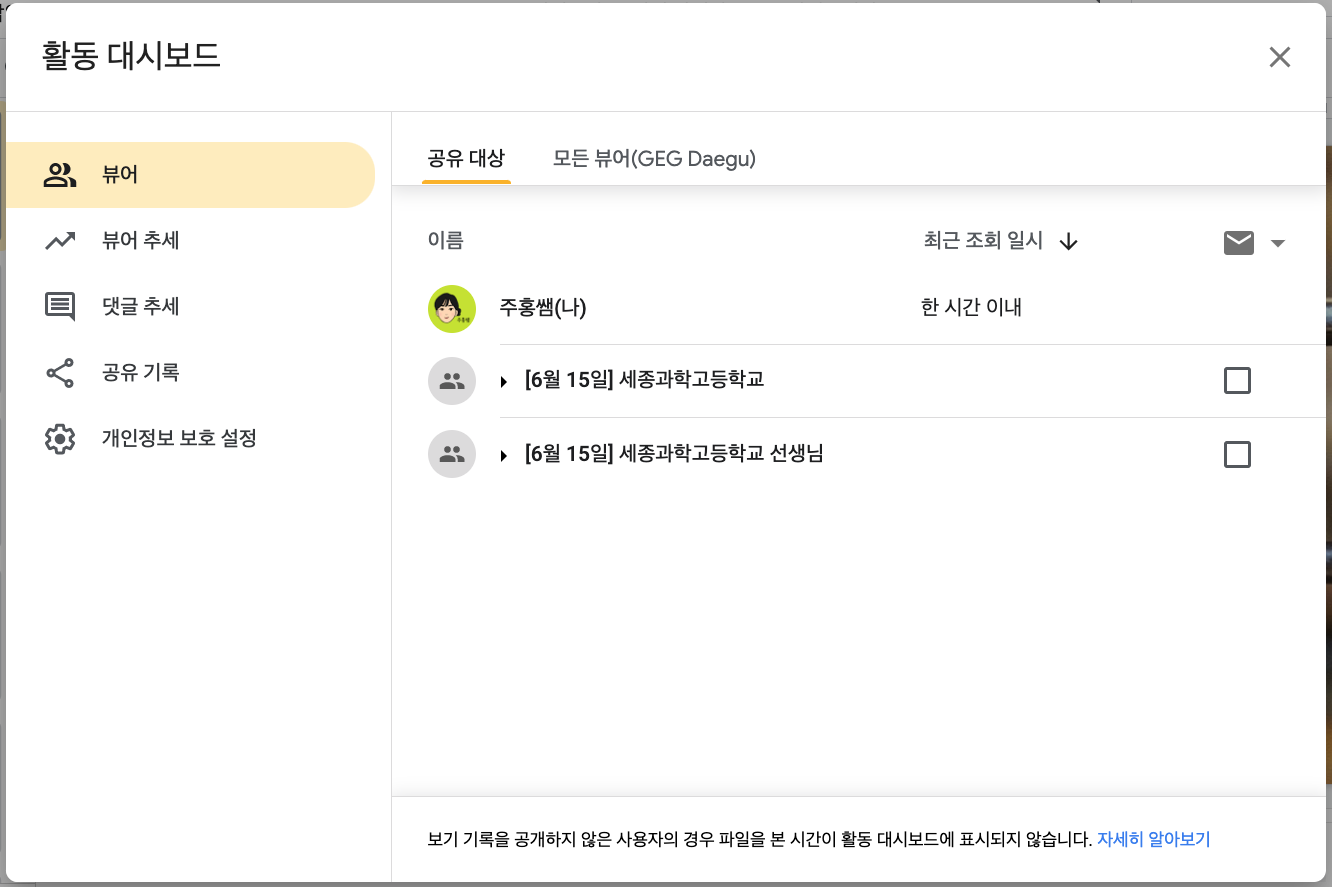 - 모든 뷰어(조직명): 맨 오른쪽 사진과 같이 해당 G Suite 조직에서 누가 언제 봤는지가 기록으로 나타납니다.