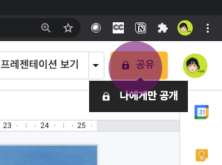- 뷰어: 해당 슬라이드에 대한 뷰어(보기) 권한을 갖고 있는 계정의 명단입니다. 현재 그 누구와도 공유하지 않은 상태라면 맨 왼쪽 사진처럼 보입니다. 공유를 하게 되면 가운데 사진처럼 보입니다.