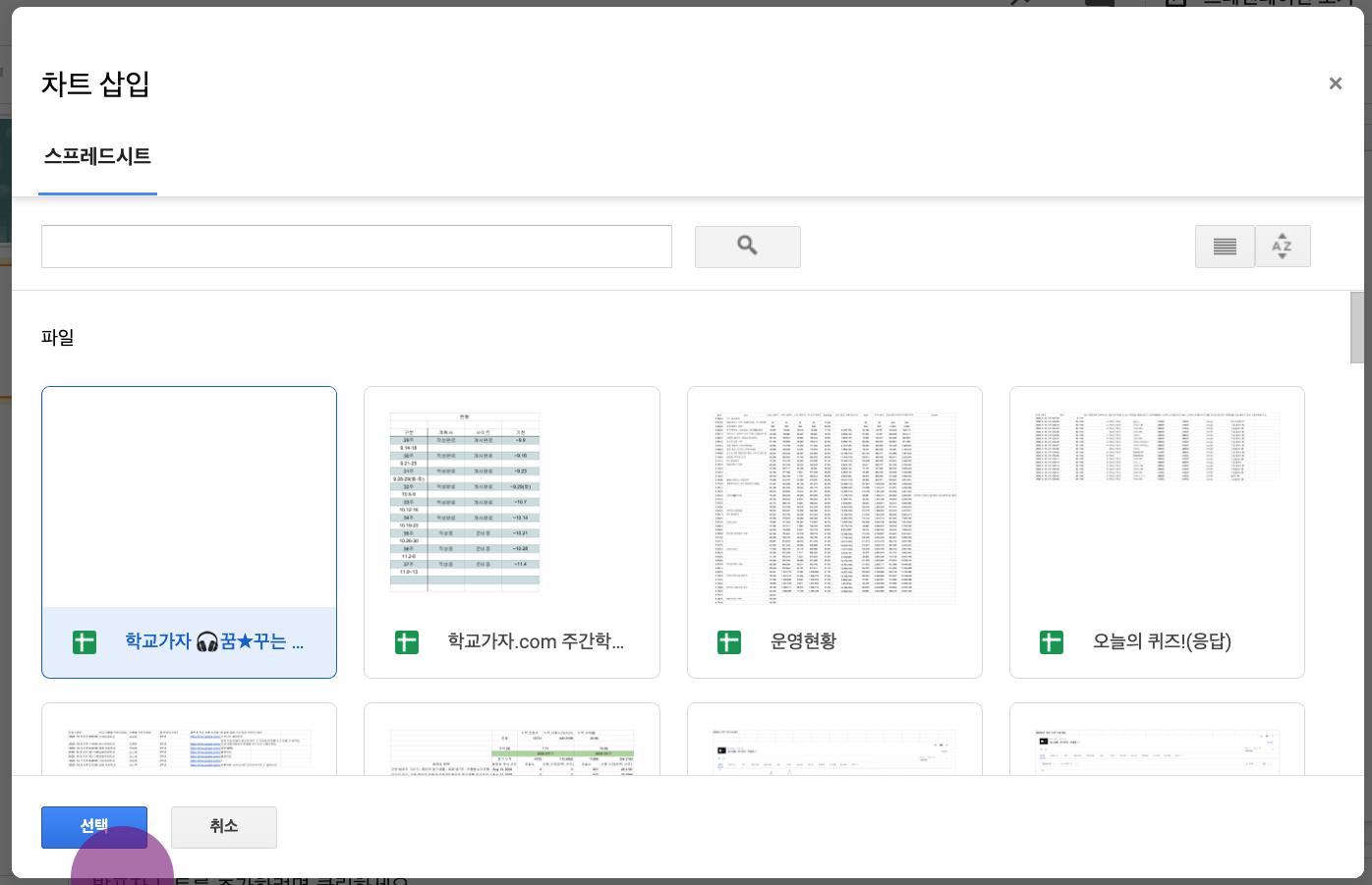 그럼 왼쪽 사진과 같은 차트 삽입 창이 뜨는데요, 여기서 원하는 그래프가 있는 스프트레드시트를 누르고 선택 버튼을 누릅니다.
