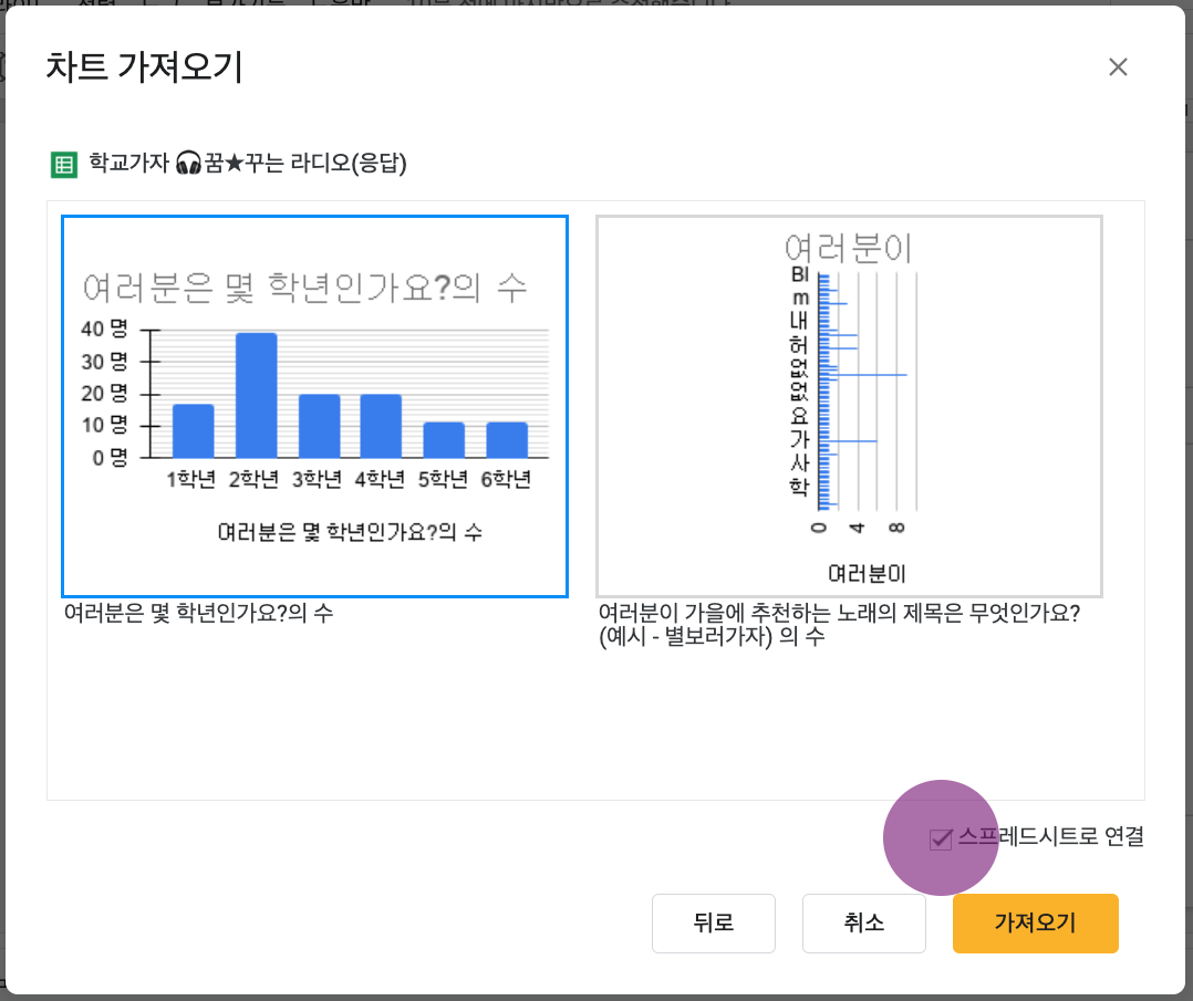 구글 프레젠테이션에 구글 스프레드시트의 그래프를 삽입하는 기능입니다.