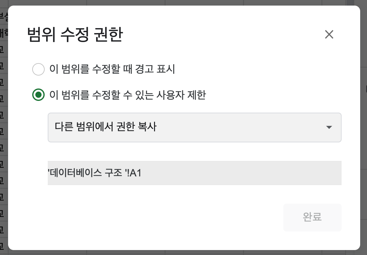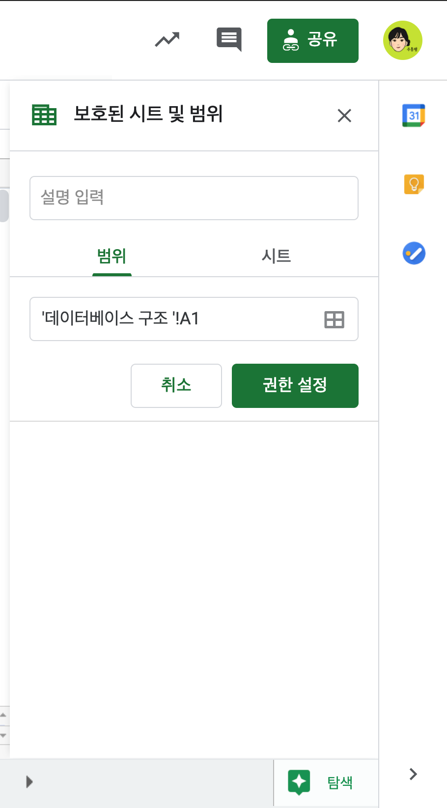 맨 왼쪽 사진처럼 현재 여러분이 있는 워크시트에 대한 권한만 먼저 보이는데요, (현재 '데이터베이스 구조'라는 워크시트에 있습니다)