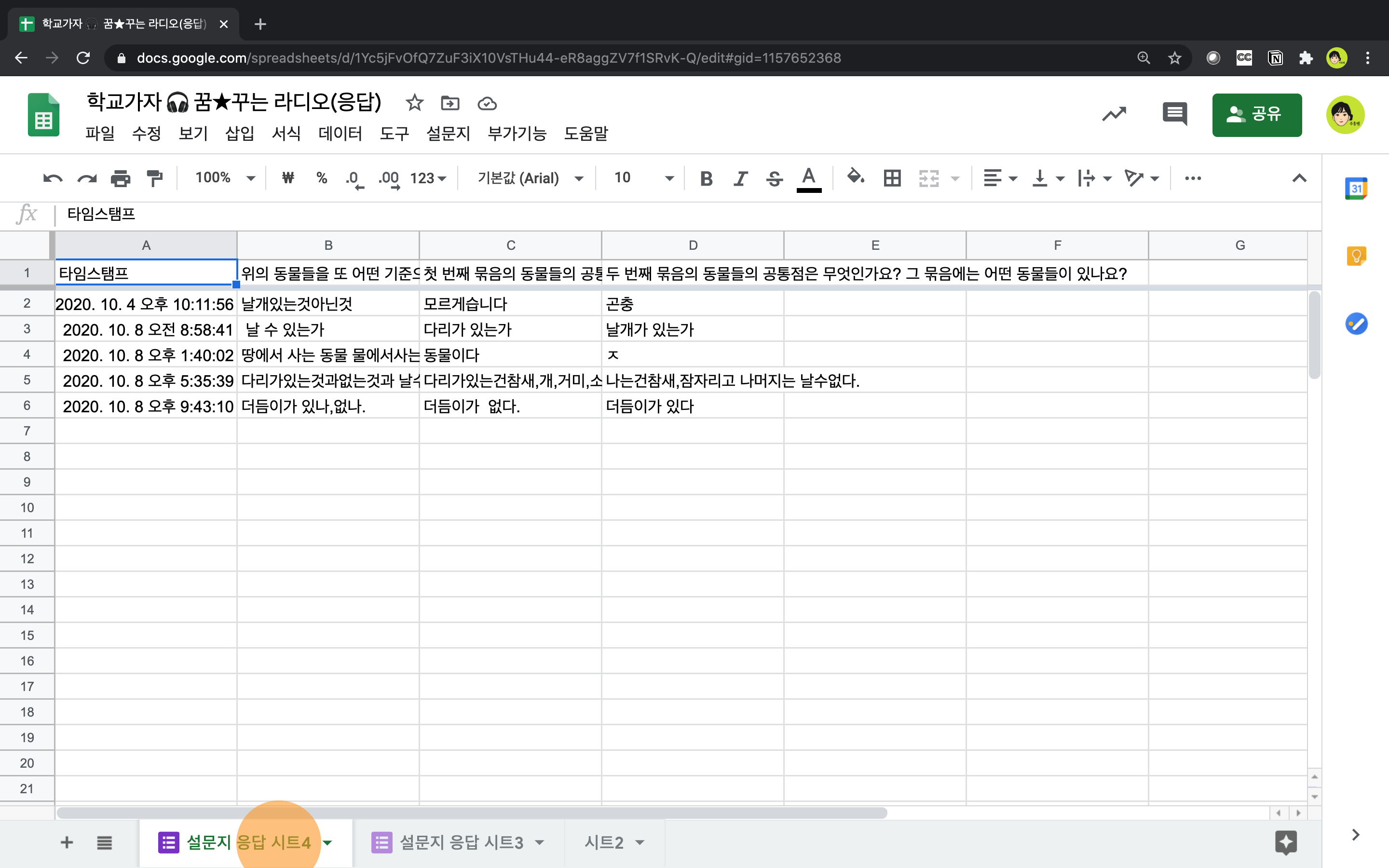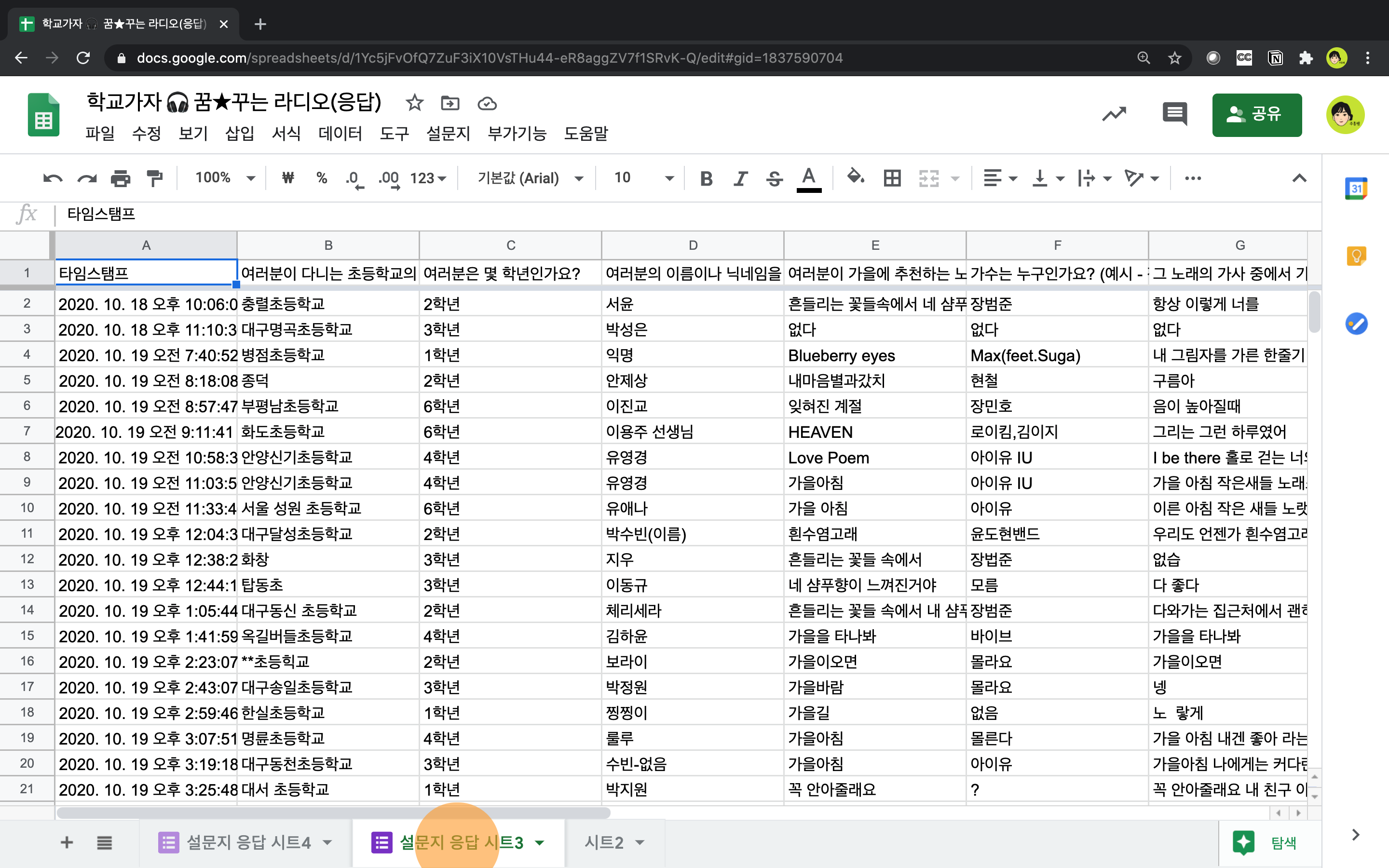 이때 위의 사진처럼 하나의 스프레드시트에 여러 개의 설문지 결과를 모을 수 있습니다.