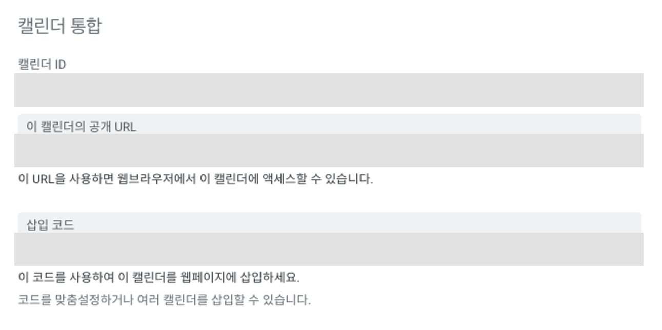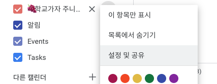 - GCalendar Sync: 해당 구글 캘린더의 캘린더 id를 입력해야 합니다. 이 캘린더 id는 구글 캘린더에서 1) 왼쪽 사진처럼 해당 캘린더 왼쪽의 점 3개 버튼을 누른 후 설정 및 공유를 누르고, 2) 아래로 내려 캘린더 통합 부분에서 찾을 수 있습니다. 하나의 워크시트당 하나의 달력만 관리할 수 있습니다. 완전히 무료입니다.