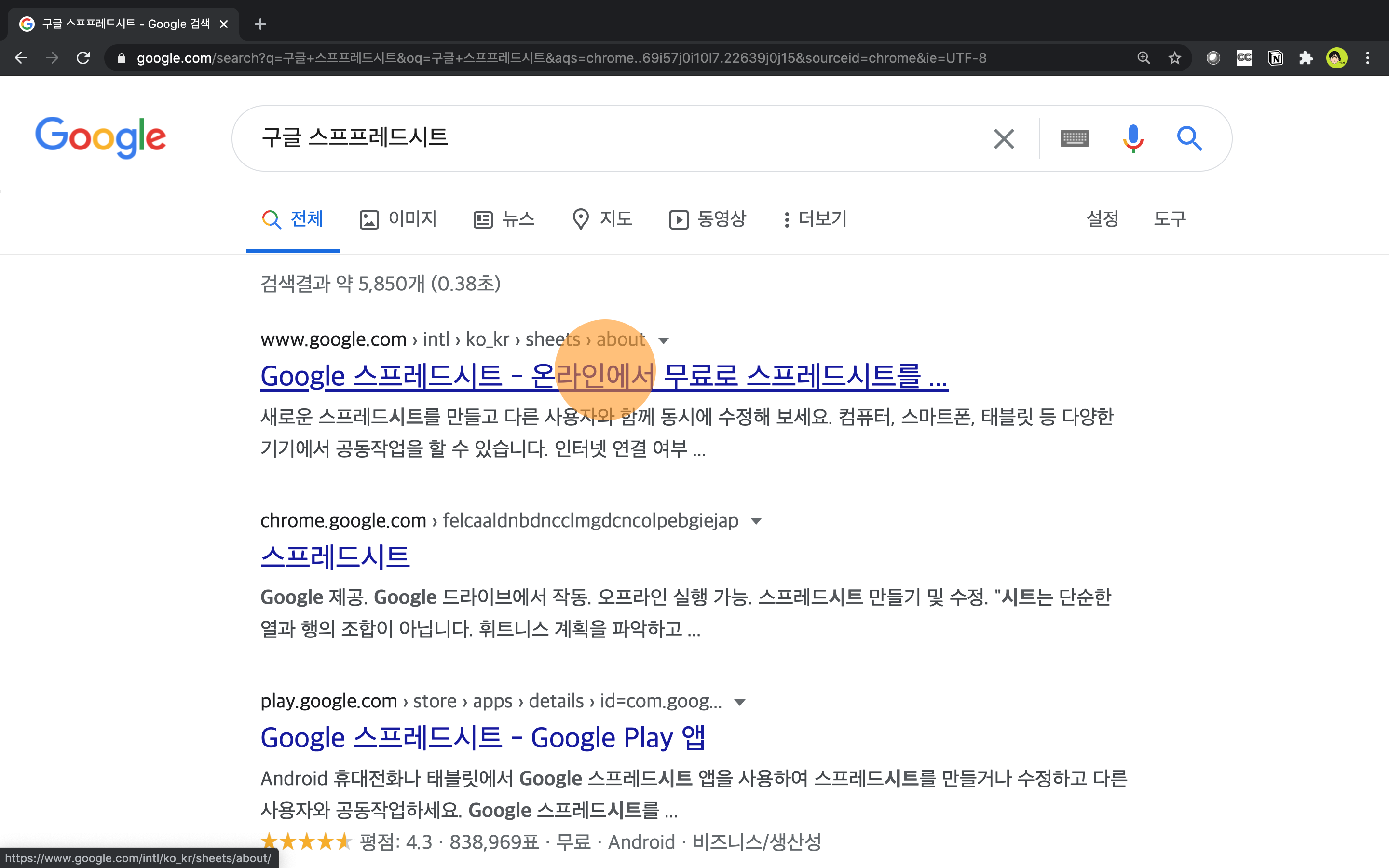 검색창에 URL을 직접 입력합니다. (sheets.google.com/)