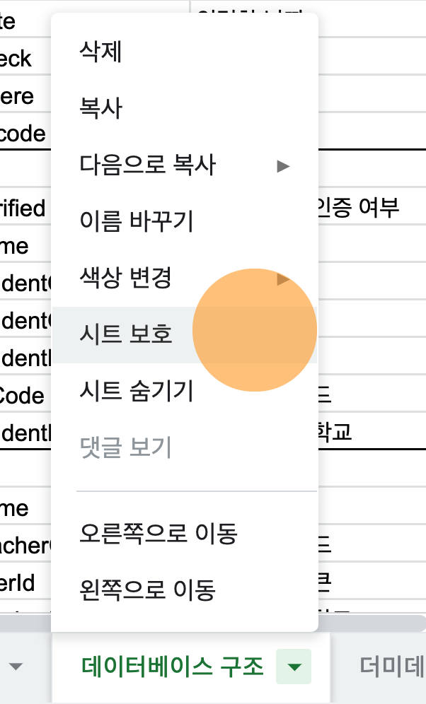 복사하고자 하는 워크시트 옆의 ▼ 버튼을 누르고, 시트 보호를 누릅니다.