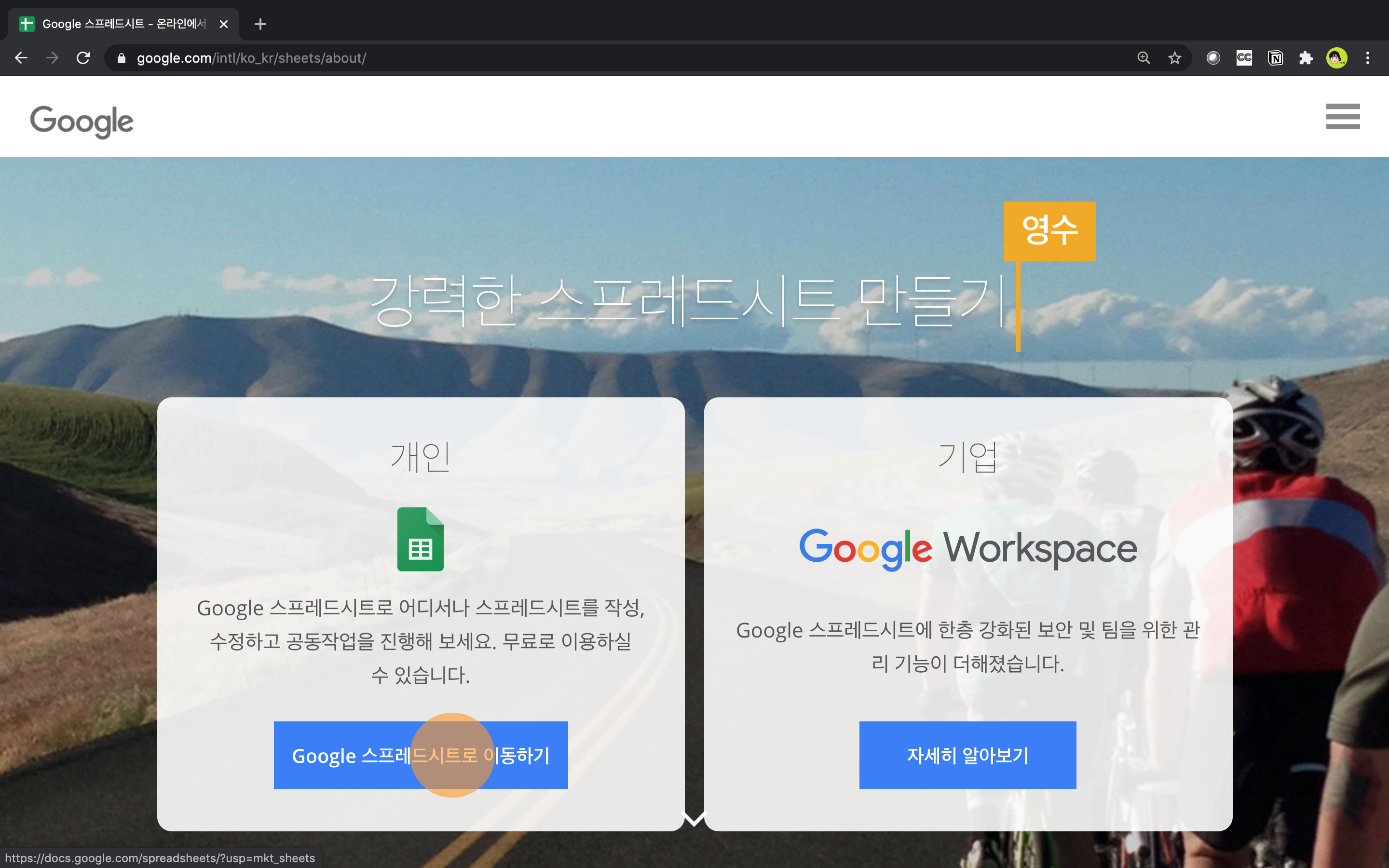 첫번째로 나오는 주소로 들어간 뒤(www.google.com/intl/ko_kr/sheets/about/), 다음 화면에서 '개인' 아래의 Google 스프레드시트로 이동하기 버튼을 누릅니다.