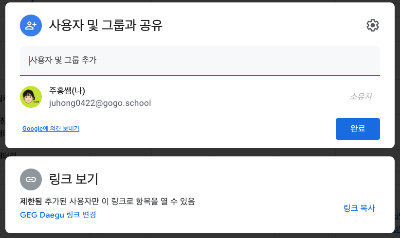 - 조직명(화면상 GEG Daegu): 가운데 사진의 경우처럼 G Suite 계정일 경우에만 나타나는 옵션입니다. 조직의 전체 사용자만이 이 링크로 들어와 편집할 수 있습니다.