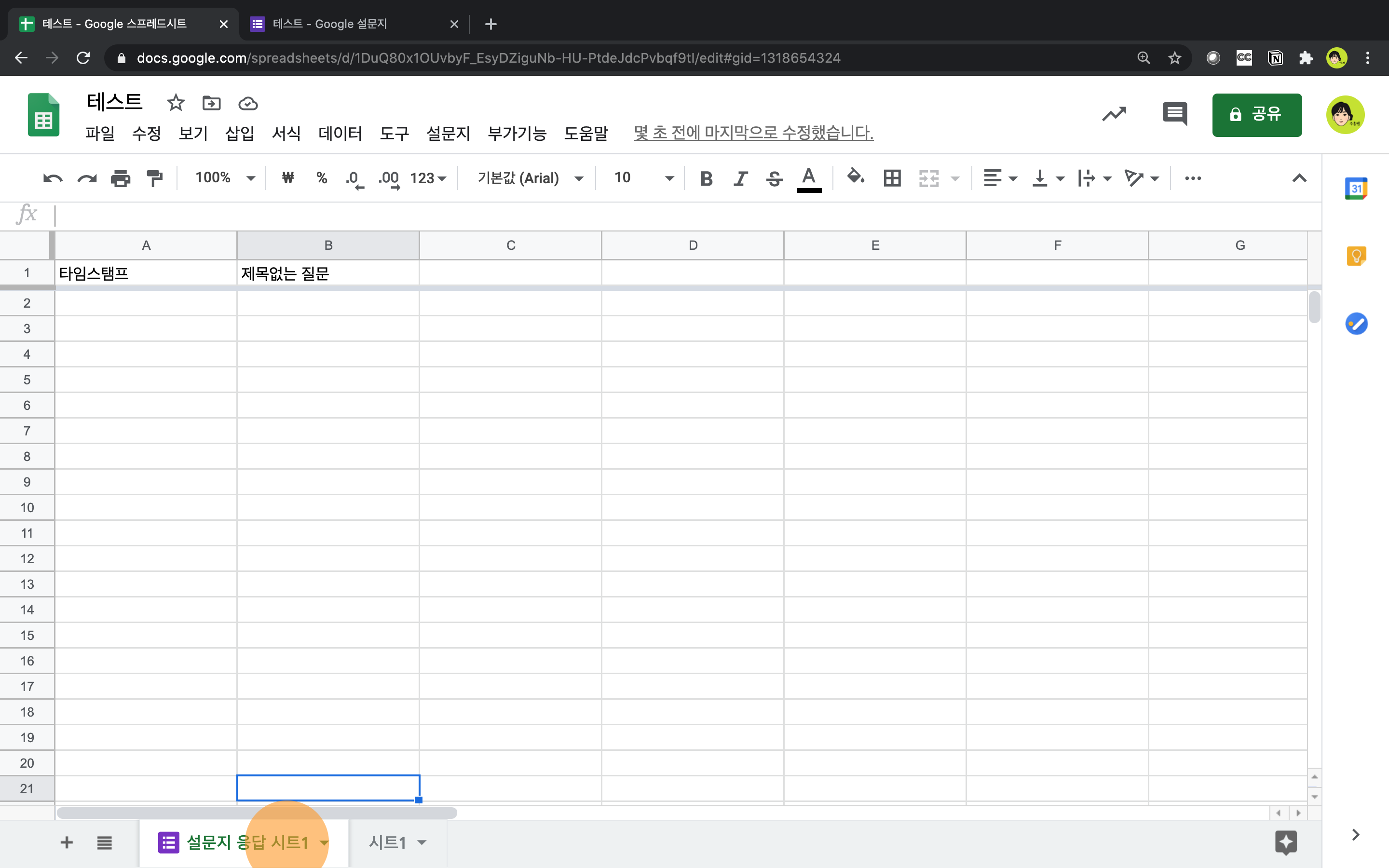 스프레드시트로 돌아오면, '설문지 응답 시트' 라는 이름의 새로운 워크시트가 만들어져 있습니다.