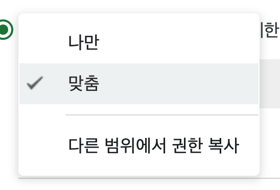 - 이 범위를 수정할 수 있는 사용자 제한: 그 아래의 맞춤을 누르면 오른쪽 사진과 같이 세 가지 옵션이 나타납니다.