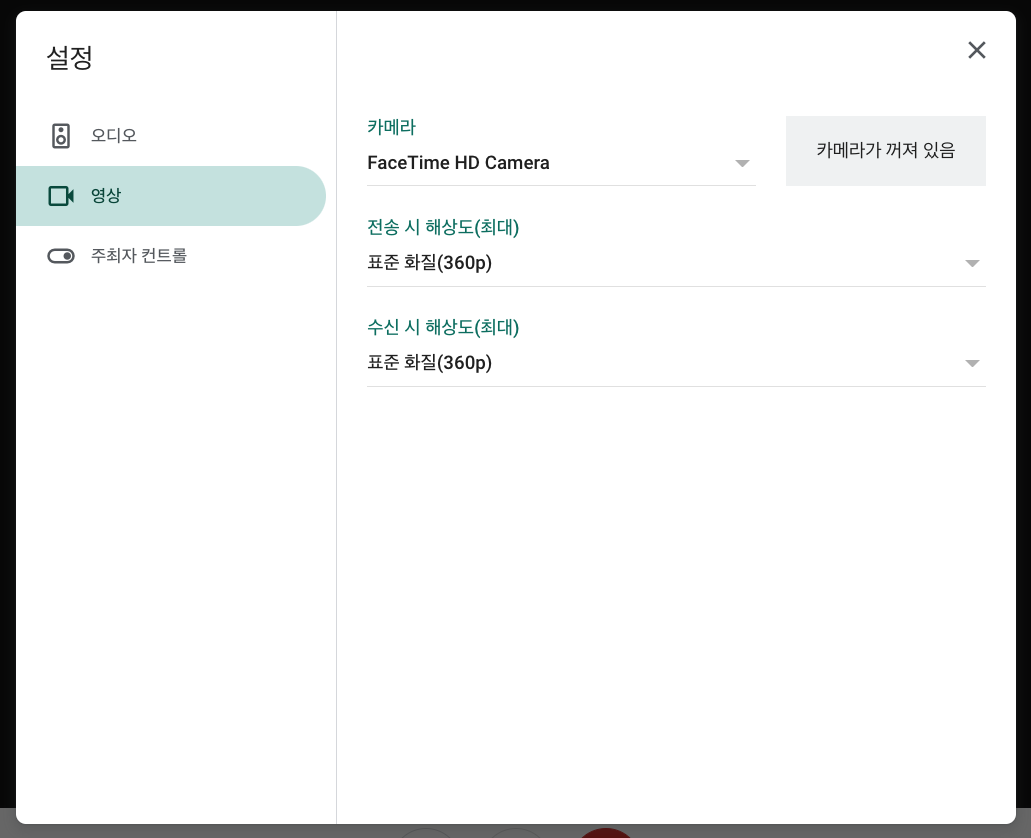 > 설정: 마이크와 카메라를 어떤 기기로 사용할지 설정할 수 있습니다.