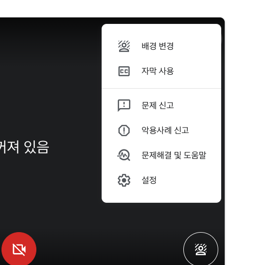 > 배경 변경: 카메라를 켰을 때, 자신의 모습 주변의 배경을 바꿀 수 있습니다. 맨 오른쪽 사진과 같은 사람 모양 버튼을 눌러도 됩니다. 왼쪽 맨 위에 있는 것은 배경을 그대로 보여주는 것입니다. 그 옆의 것은 조금 뿌옇게, 그 옆의 것은 조금 더 뿌옇게 보이도록 합니다. 이외의 다양한 배경으로도 바꿀 수 있습니다.