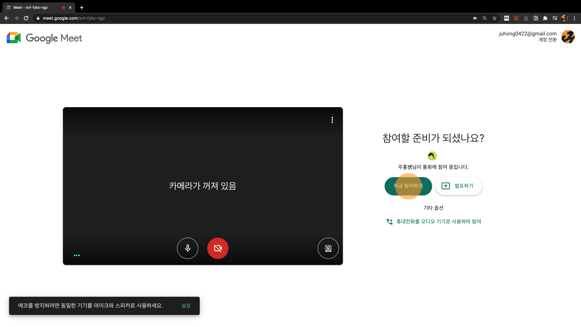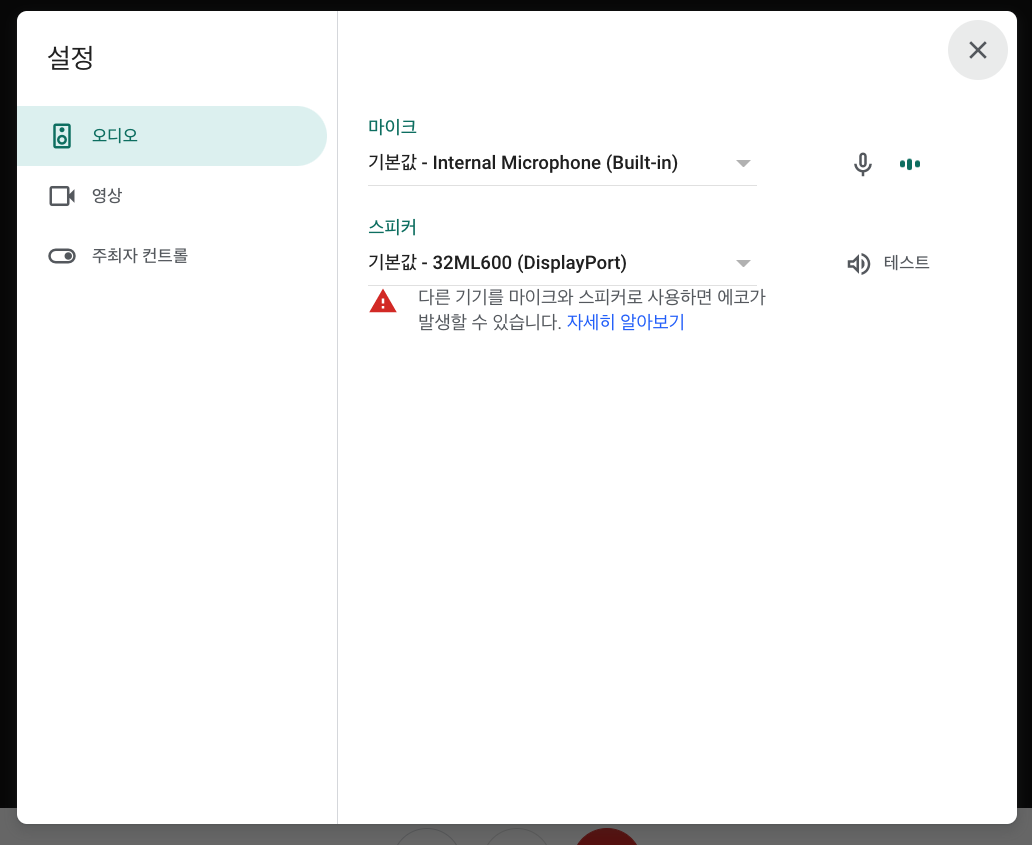 그 대신, 컴퓨터의 마이크 및 스피커는 전부 꺼 놓고, 휴대폰으로 동시에 회의를 참여하면 동일한 효과를 낼 수 있습니다. - 설정