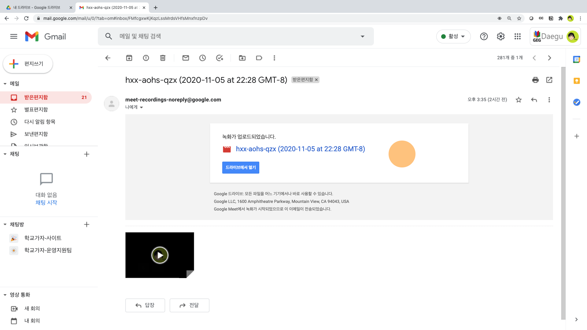 녹화된 영상은 내 드라이브의 Meet Recordings 폴더에 자동으로 저장됩니다.