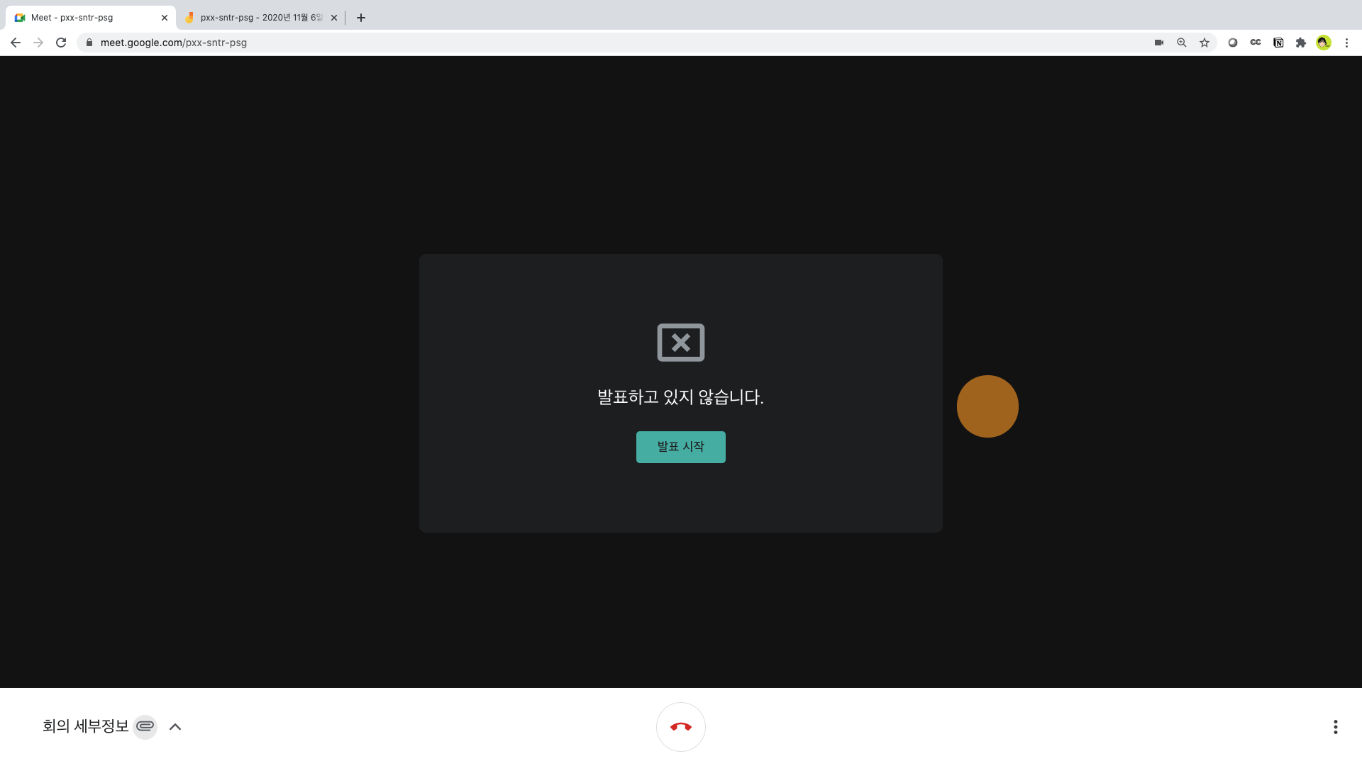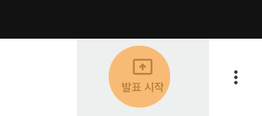 회의 중간에 발표 화면을 보여주려면 왼쪽 사진과 같이 오른쪽 하단의 발표 시작 버튼을 누릅니다.