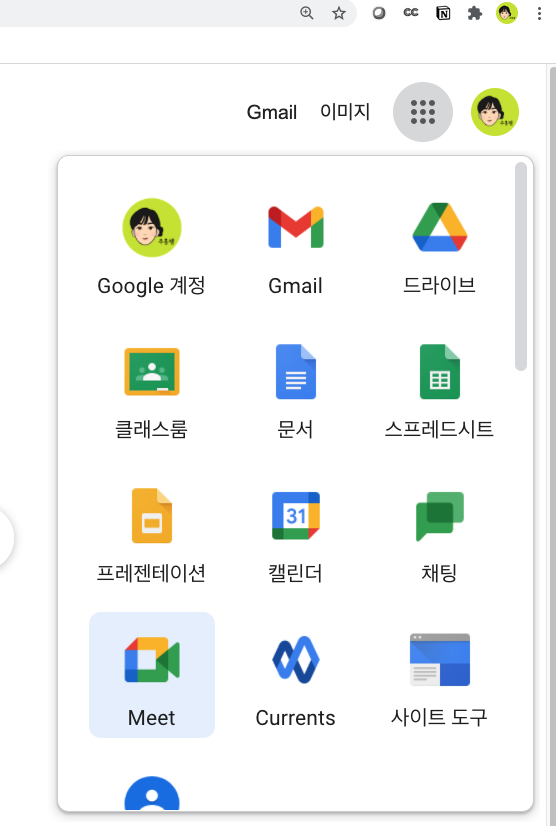 크롬을 사용하고 있다면, 오른쪽 상단에 '이미지'와 프로필 사진 사이의 점 9개 버튼을 클릭합니다. 뜬 창에서 Meet를 클릭합니다.