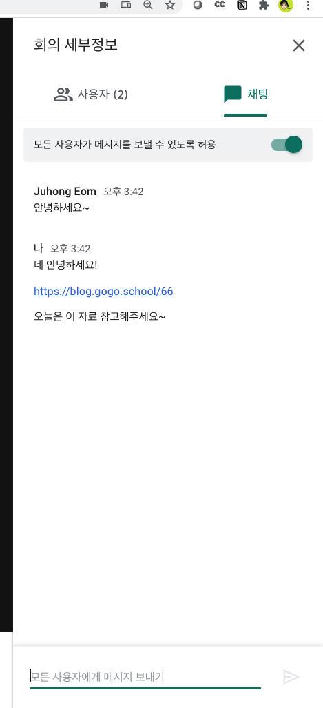- 채팅: 참여자와 주최자가 메시지를 보내 대화를 할 수 있는 창입니다. 하단에 메시지를 입력하고 키보드의 엔터 키를 누르거나 ▻ 모양 버튼을 누릅니다. 하이퍼링크를 올릴 수 있고, 이미지, 동영상 등은 올릴 수 없습니다.