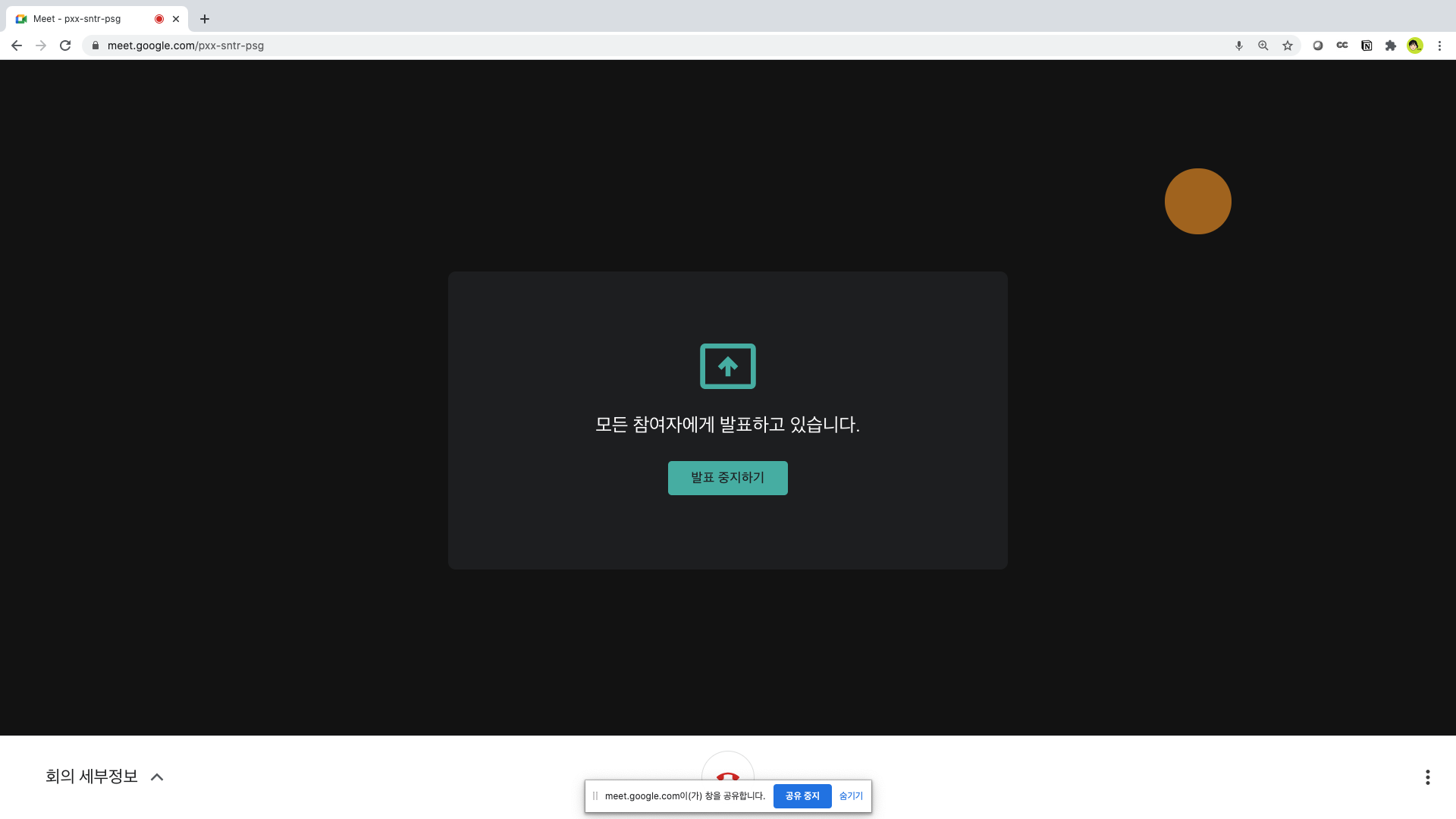 화면 공유하기 창에서 공유할 화면을 선택하고 나면, 왼쪽 사진과 같은 화면이 나타납니다.