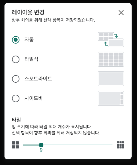 - 타일식: 여러 명의 참여자의 얼굴 화면이 동시에 나옵니다. 타일 개수를 아래에서 조정할 수 있습니다.