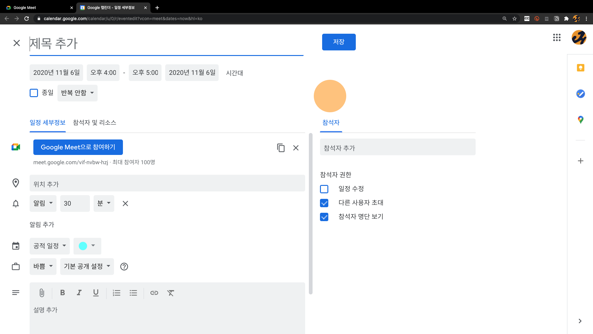 1) 왼쪽 사진과 같은 구글 캘린더 탭이 나타나면 일정의 제목, 내용, 시각, 참석자 등을 적어줍니다.