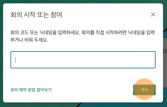 공유받은 URL 이나 화상회의의 코드를 적고 계속 버튼을 누릅니다.