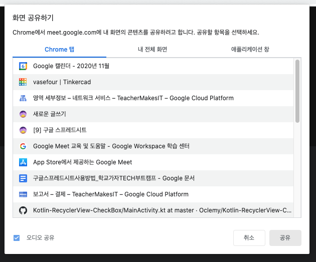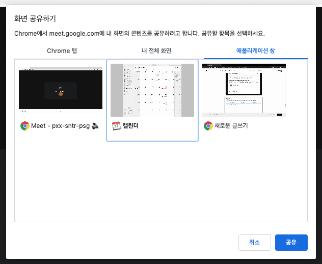 여기서 Chrome 탭, 내 전체 화면, 애플리케이션 창에서 원하는 것을 고를 수 있습니다.
