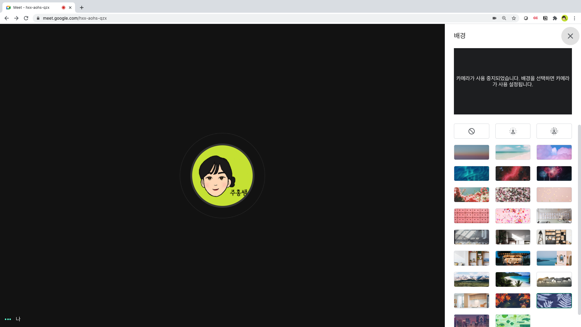 카메라를 켰을 때, 자신의 모습 주변의 배경을 바꿀 수 있습니다. 맨 오른쪽 사진과 같은 사람 모양 버튼을 눌러도 됩니다.