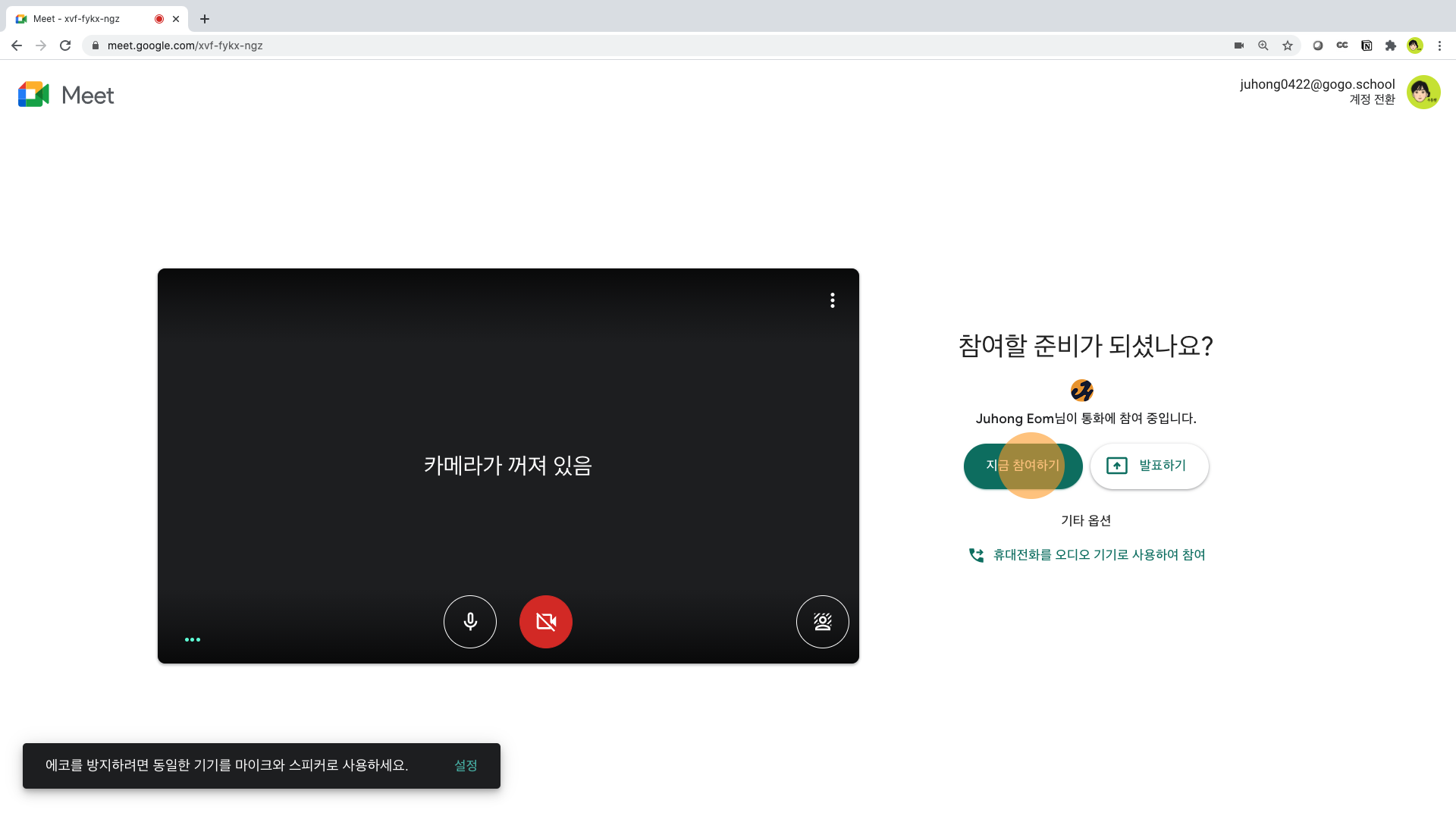 위 사진과 같은 화면의 오른쪽 부분에 있는 지금 참여하기 버튼이나 발표하기 버튼 중 하나를 골라 누르면 됩니다.