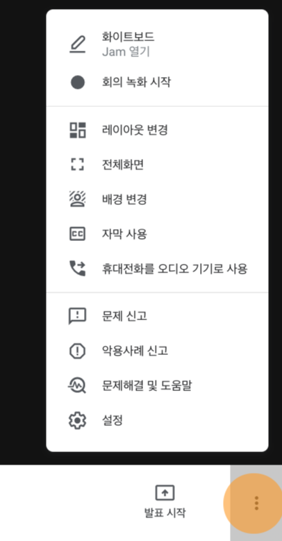 - 발표하기: 발표 전용 통화로, 얼굴 화면이 나타나지 않습니다.