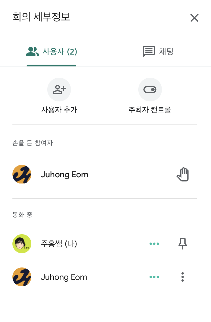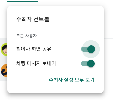 - 주최자 컨트롤: 이 버튼을 누르면 오른쪽 사진과 같은 창이 나타납니다. 위의 점 3개 버튼을 누른 뒤 '설정' 에서의 주최자 컨트롤 부분과 같습니다.