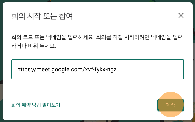 공유받은 URL 이나 화상회의의 코드를 적고 계속 버튼을 누릅니다.
