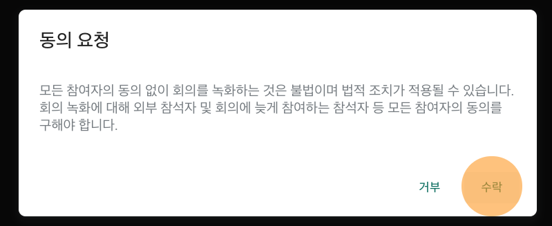 회의 녹화는 모든 참여자가 녹화에 동의를 해야 가능합니다.