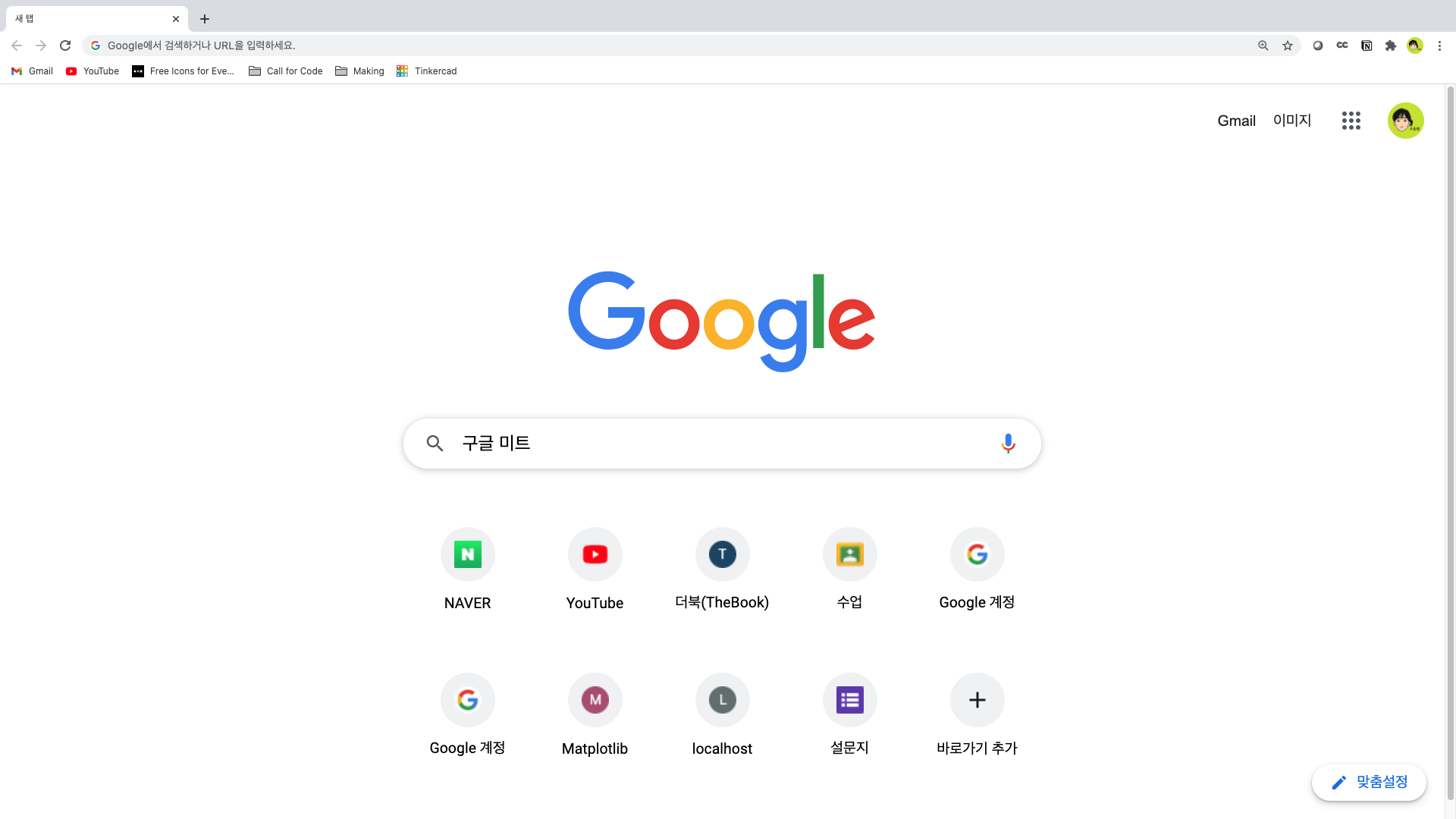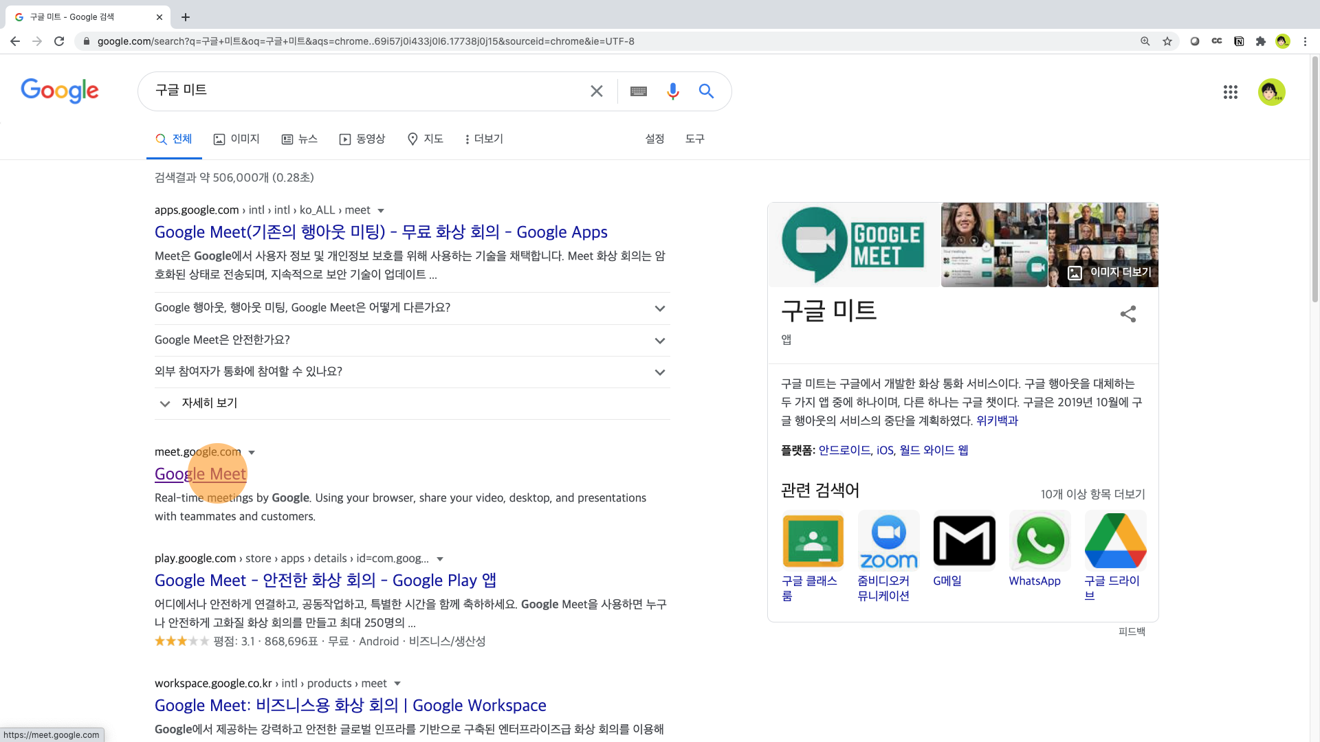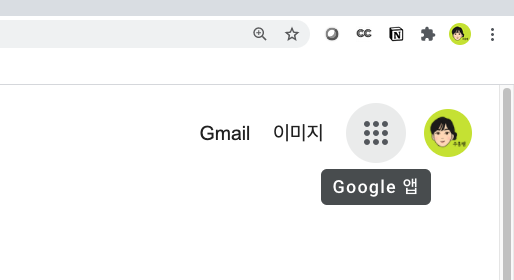 크롬을 사용하고 있다면, 오른쪽 상단에 '이미지'와 프로필 사진 사이의 점 9개 버튼을 클릭합니다. 뜬 창에서 Meet를 클릭합니다.