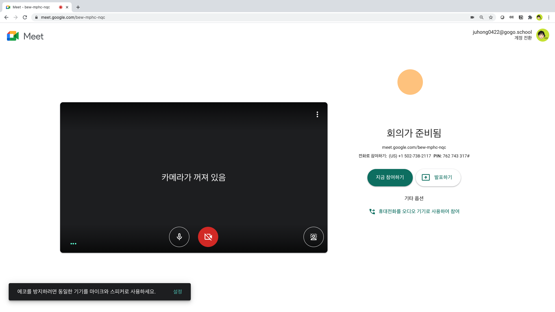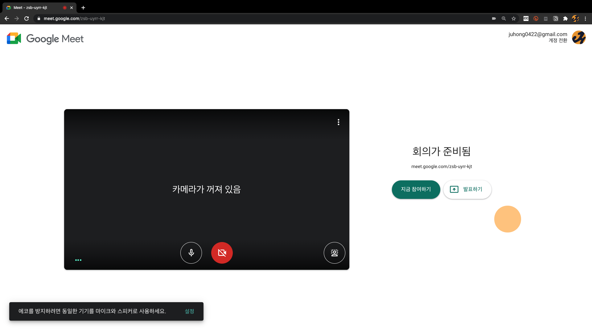 지금 그 링크를 받아 놓고 언제든지 그 링크로 들어가기만 하면 위의 화면이 나타나며 화상 회의를 진행할 수 있습니다.