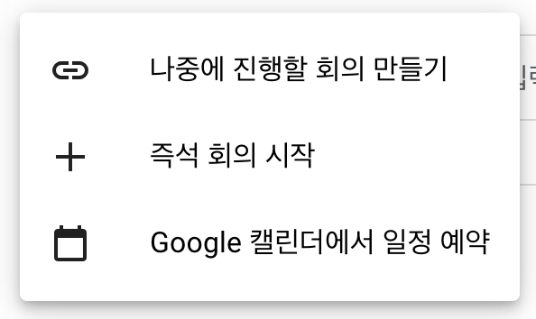여기서 왼쪽 사진과 같이 초록색 새 회의 버튼을 누르면, 오른쪽 사진과 같이 3개의 옵션이 나타납니다. 하나씩 알아보겠습니다.