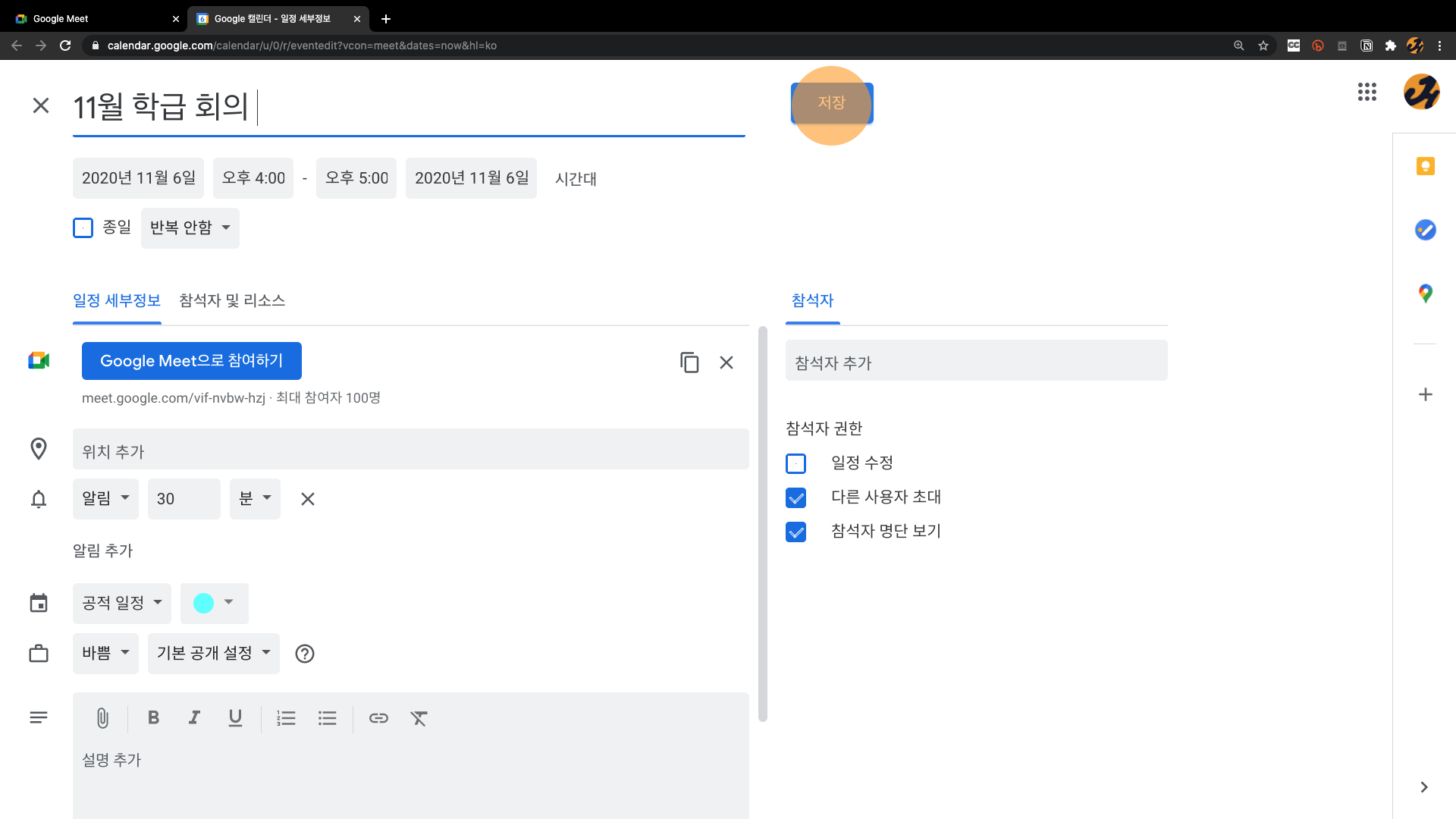 **구글 캘린더에서 일정을 만들 때 Meet 회의 추가 버튼을 눌러도 일정과 함께 구글 미트 url이 저장됩니다.